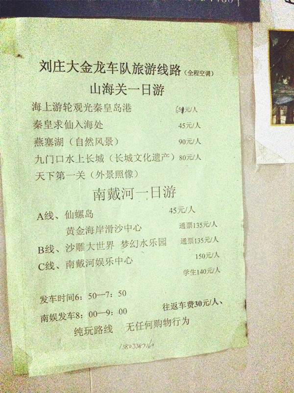 P.S. 这是住的地方楼下贴的,意思就是门票全部原价,不管你是不是学生还是60周岁以上的老年人,往返车费30元/人,住宿老板和大金龙旅游公司勾结在一起。如果找外面那些拉活儿的黑车司机,票价就会有折扣,而且会送你去,但是需要找到比较好好的司机,否则会被坑。