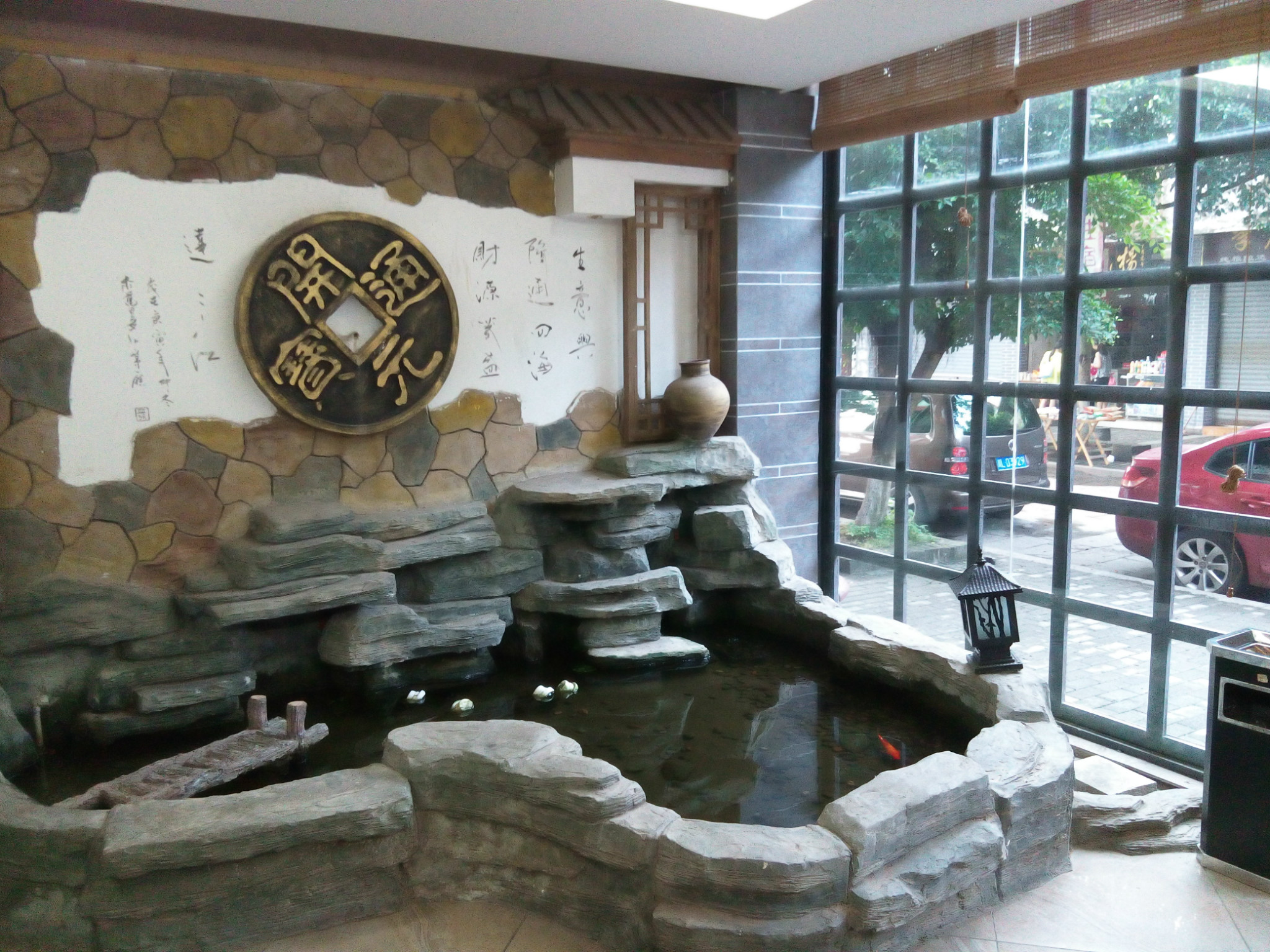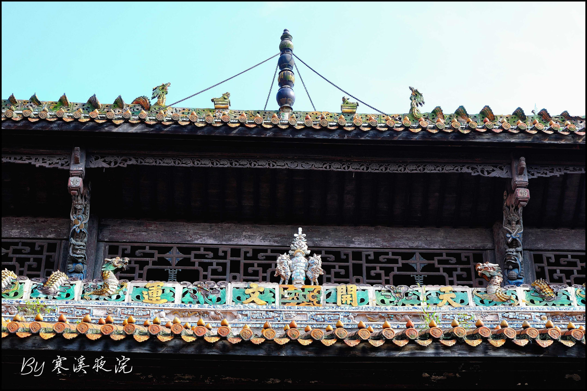 大厅正前方墙壁上,挂着刘光第所赠的“龙光永榭”匾。匾下是五彩缤纷、构思精巧的“鸡冠罩”。“鸡冠罩”是房屋通道 上的装饰构件。这个“鸡冠罩”的图案,中为“百鸟朝凤”,左右各一幅对称的“鱼跃龙门 ”,然后分别是“野鹿含花”和“鹿鹤通泰”。几幅图案用瓜和藤蔓串在一起,取《诗经.大雅》“绵绵瓜瓞,民之初生”句意,表现了主人希望子孙绵延不绝,一代更比一代强的愿望。