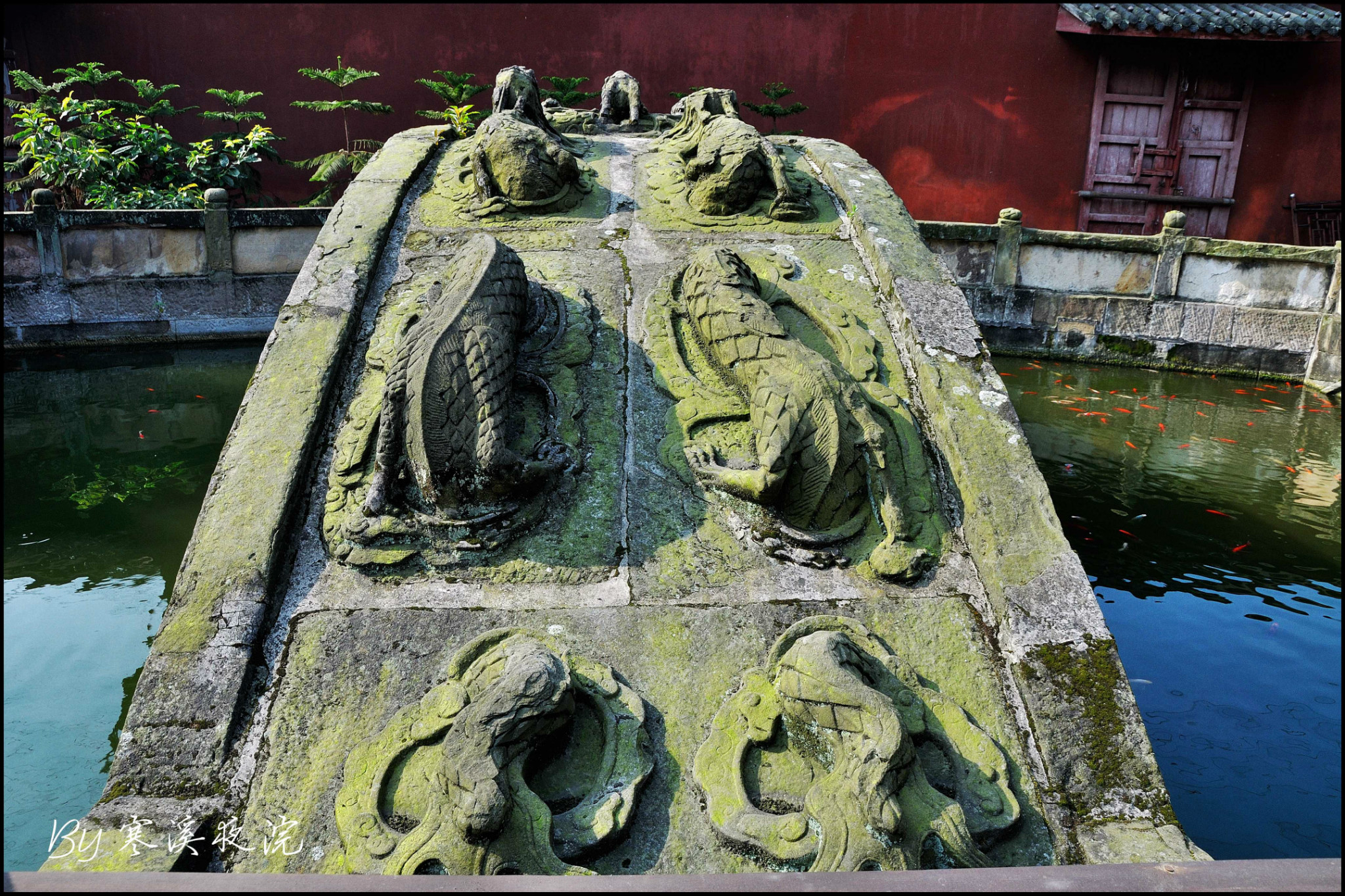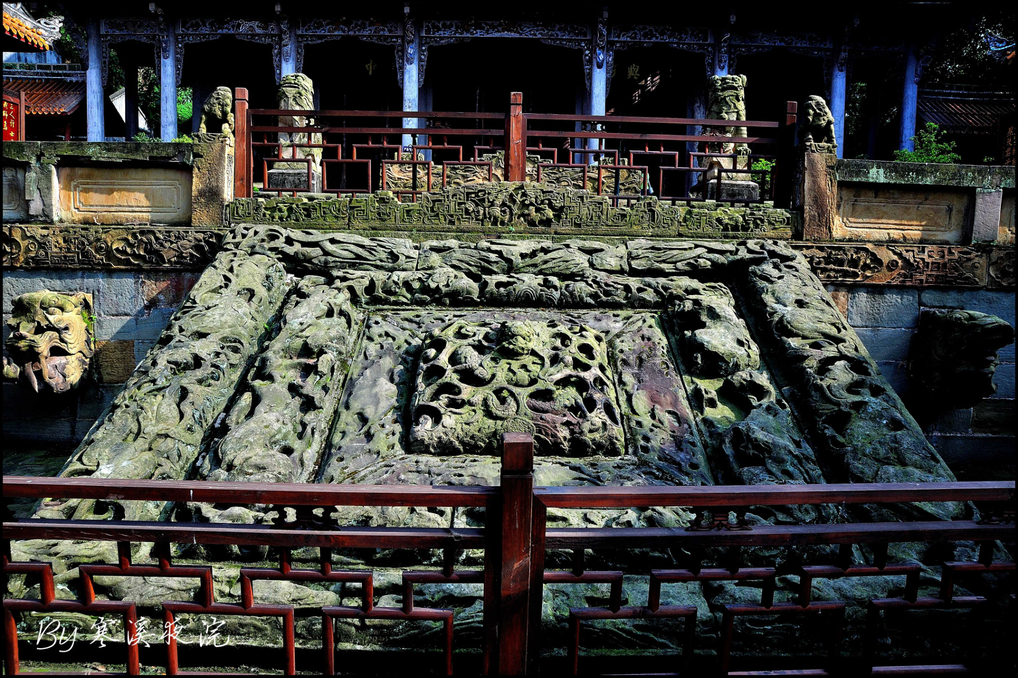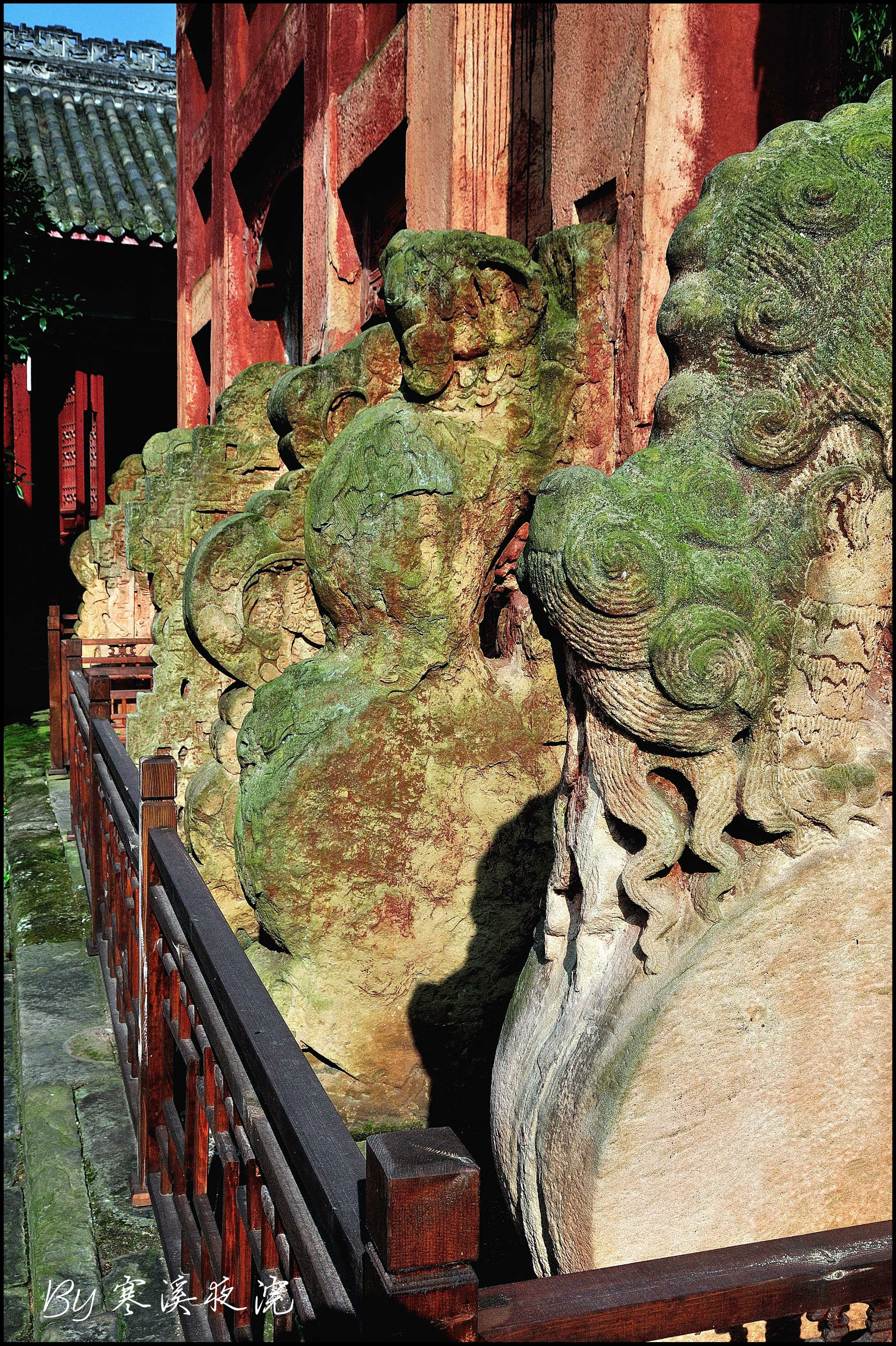 整个建筑群都凝聚着博大精深的儒家学说,如泮池、状元桥以及棂星门。泮池就是学校的意思,意味着进入孔子之门也就进入了读书求官之门,如果有幸蟾宫折桂,就可以从状元桥上通过。棂星为天上文星,意思是孔子是天上文星下凡,经过棂星门方才算正式进入了孔子门下。富顺文庙 的状元桥为九龙 镂空石拱桥,这跟许多文庙的状元桥为平板桥相比,更具特色;棂星门由12根冲天石柱 联排构成,最高的石柱 达12.8米,超过曲阜 孔庙棂星门10.34米的高度。大成殿门前的九龙 丹陛,为三层镂空九龙 石雕,可为富顺文庙 石刻代表。