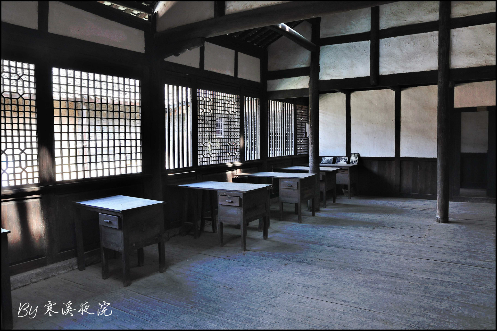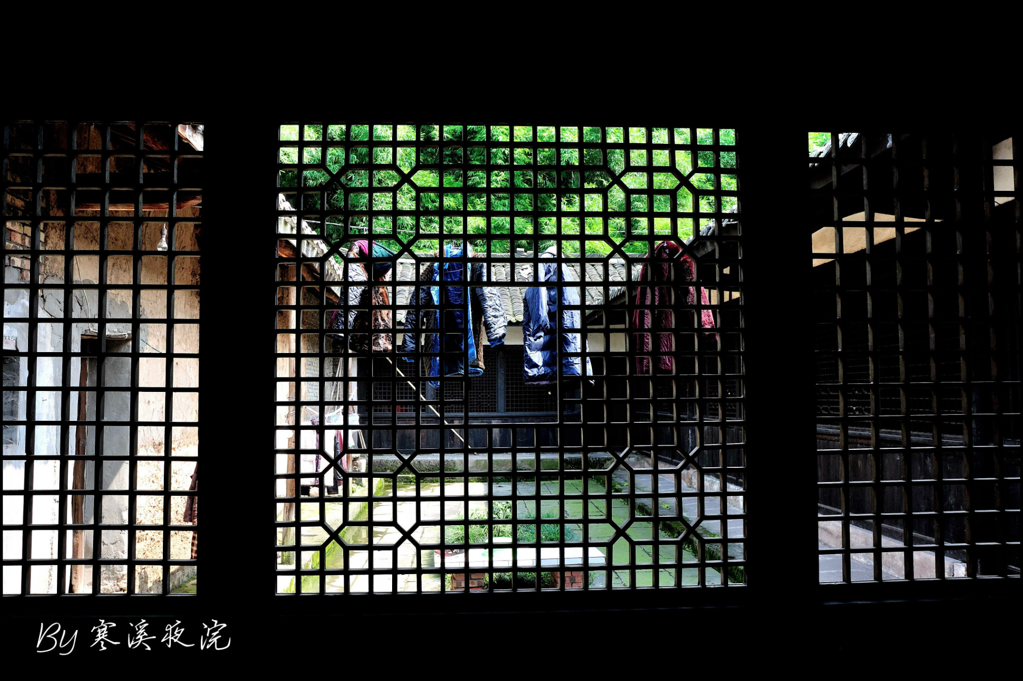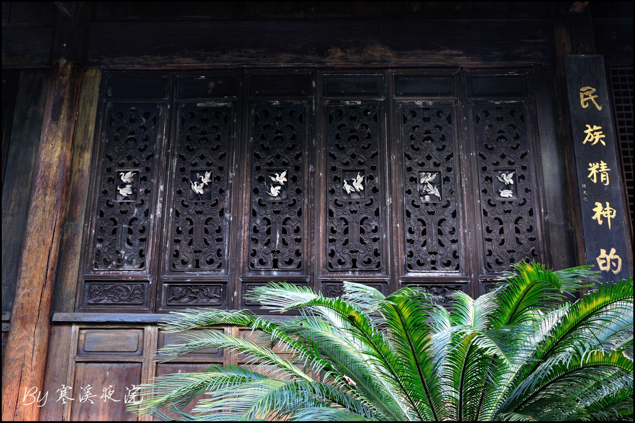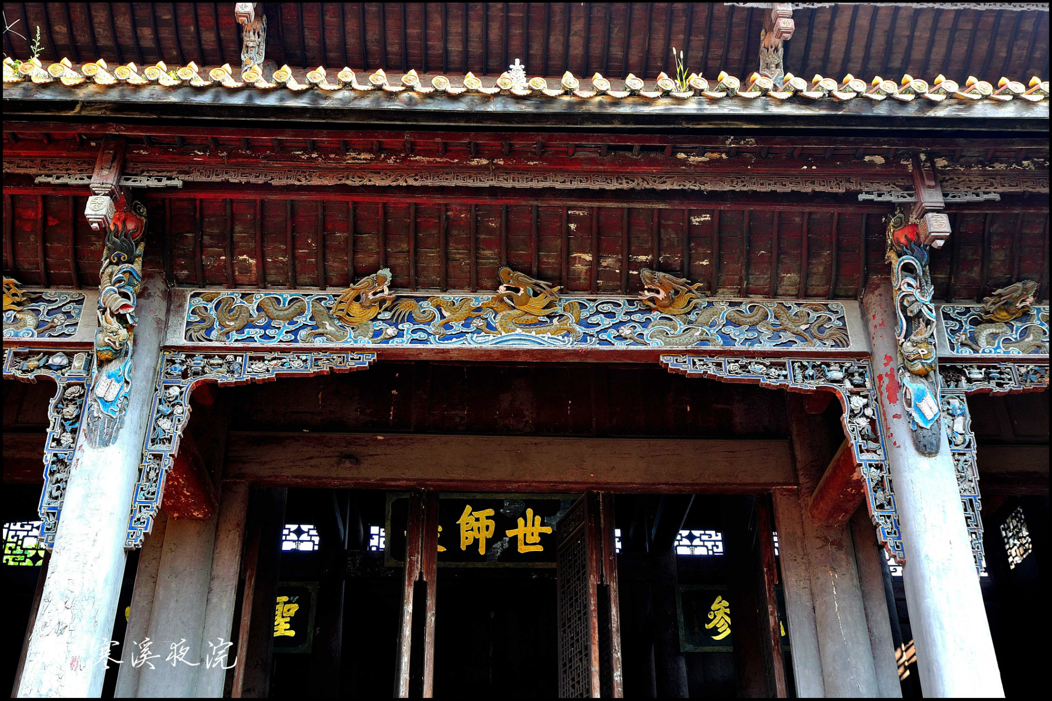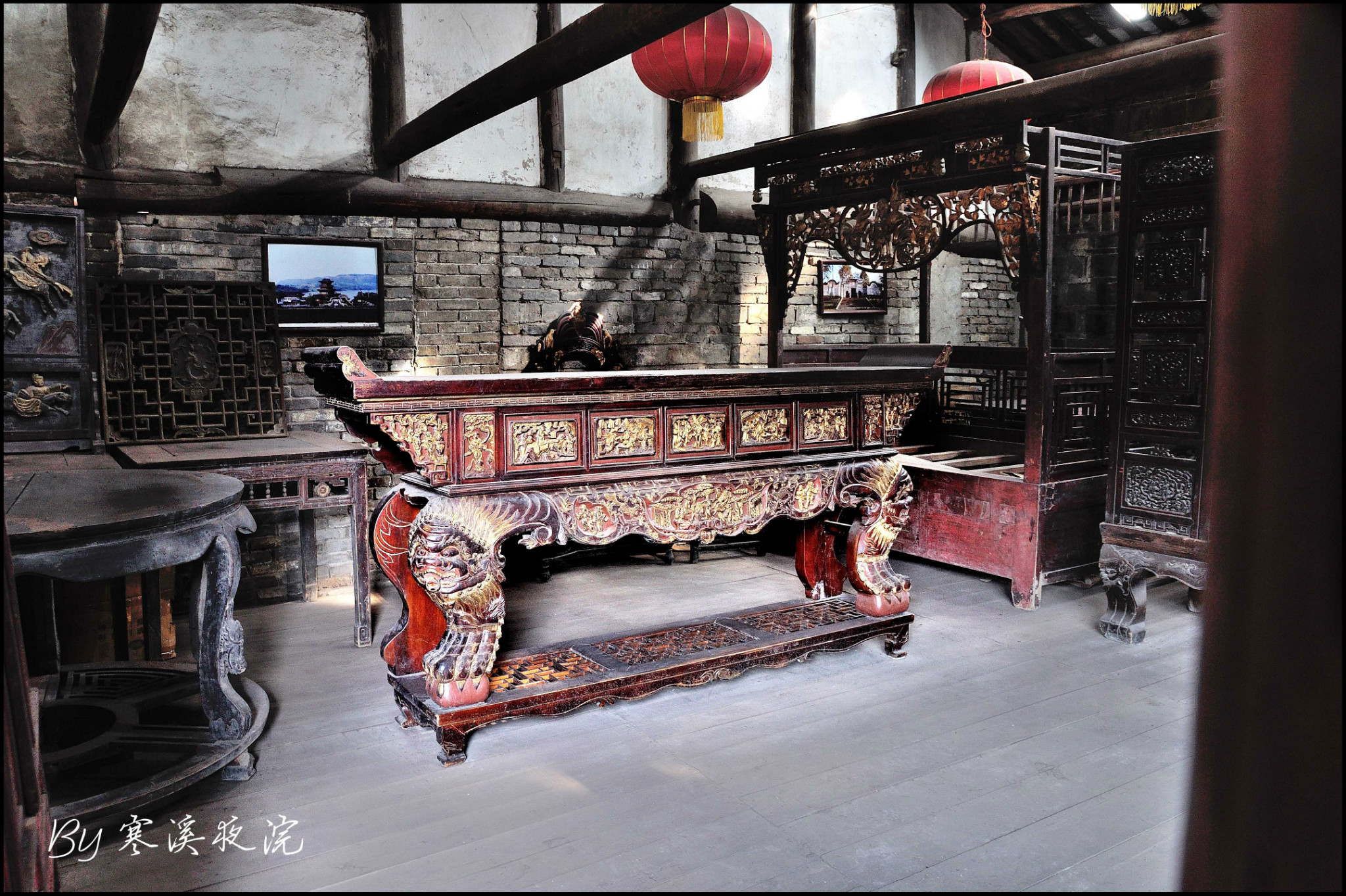 前厅正面朱红色的木板墙,是可以开合的“十四抹、二十八扇”雕花带窗式木门。平时用门栓杠起来作墙,只留中门敞开,供人进出。如遇进出人流量大之时,则打开所有门扇,就形成了一个通畅的大厅。