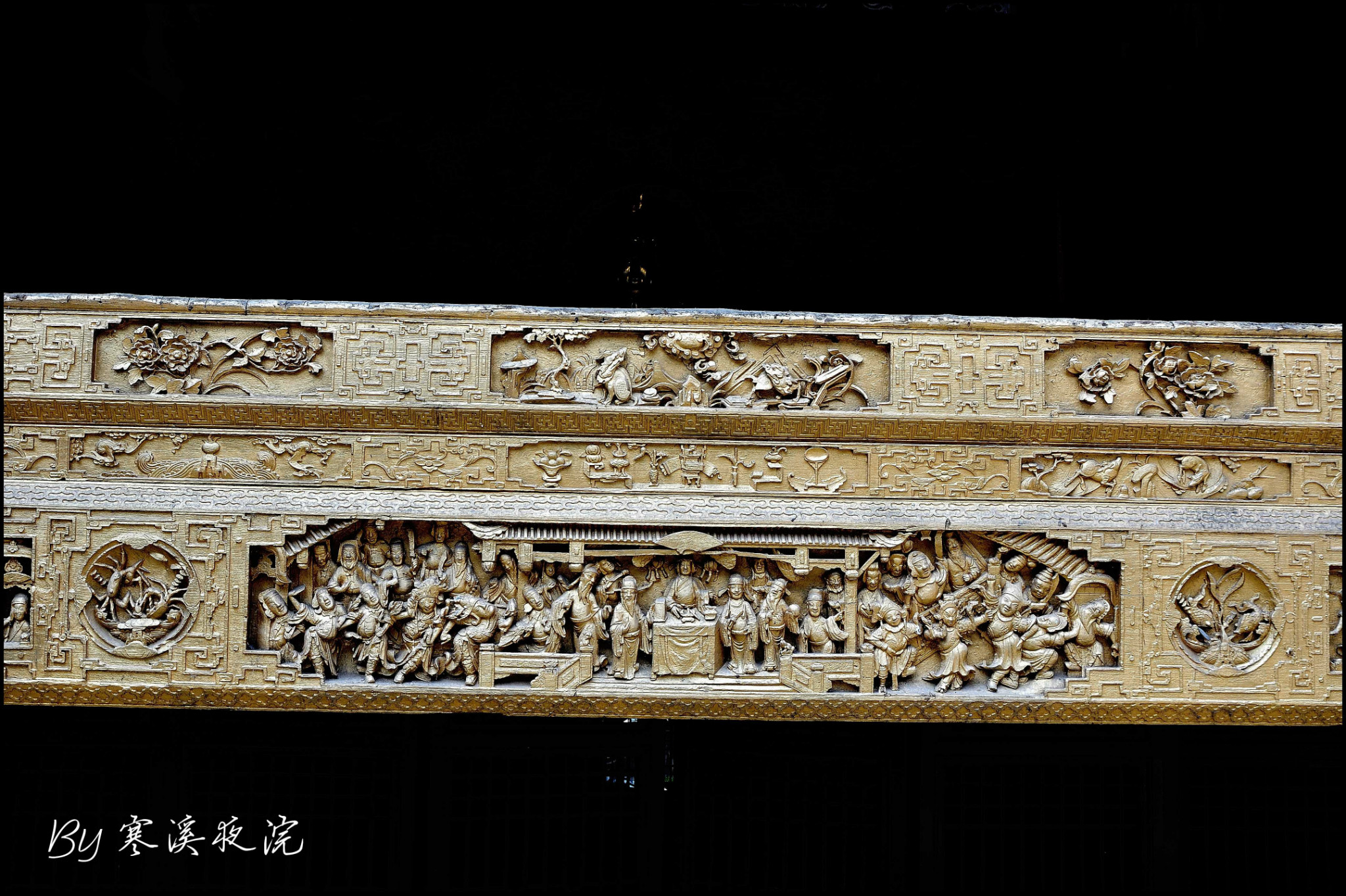 中客厅两边各一道侧门。穿过侧门,便步入了民居的另一个天地--娱乐区。这宽敞的大厅叫做“工”字厅,因其形似“工”字而得名,平时是通道 ,有事时则是品茗看戏的场地。左右两边厢房,是高、中等客人的起居室。厢房外,各有一天井,栽花植树,优美而静谧。 工字厅的正前方有一台阶。登上台阶,就是戏台。台前立柱上有一幅对联:“移影换形俨然君臣父子,假哭真笑表达离合悲欢”,构思精妙,立意深刻,无声地向人昭示:这里是戏剧的天地。台口左右华板上雕刻着《白蛇传》中的“船舟借伞”和《西厢记中》的“莺莺听琴”。人物形神毕现,栩栩如生。台前的落地罩精致绝伦,有关专家学者称赞其“集中国 民间传统木雕之精华”,自是当之无愧,其雕刻内容,有历史故事,如“黄道州发兵抗清”;有戏剧故事,如“别窑从军”;有的取材于唐诗,如“寻隐者不遇”、“清明诗”等,有民间传说,如“羊有跪乳之恩、乌有反哺之义”;有的采用谐音、象征手法表现美好的意愿的传统图案,如“挂印封候”、“富贵白头”、“路路通顺”等。