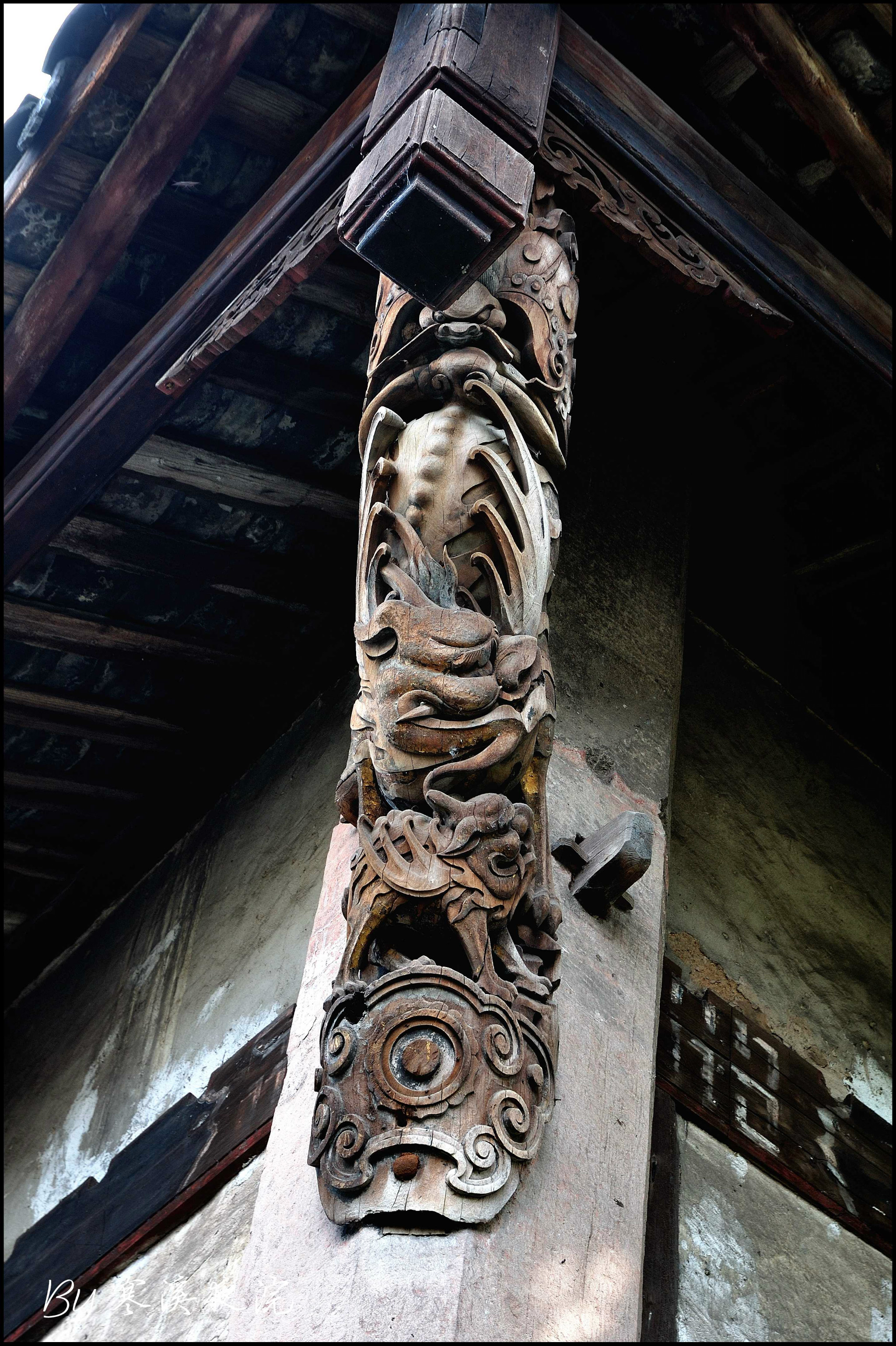 门扇上的雕刻精美、构思巧妙、蕴含丰富、刀法简练、色彩艳丽,充分展示了我国古代民间的木雕艺术。雕刻内容,一是传统典故。如“渔”、“樵”、“耕”、“读”。“渔”通过两个渔夫钓鱼和放水捉鱼的对比,形象地反映了不要竭泽而渔的哲理;“樵”则以俞伯牙、钟子期高山流水的典故告诫观者要珍惜友 谊,知音难寻;“耕”描绘的大舜耕田,其特别之处在于使用的是大象,而不是牛,这既是农耕有历史的真实再现,又蕴含了“万象 更(耕)新”的寓意;“读”用的是梁山伯祝英台梨山功书的典故。“渔”、“樵”、“耕”、“读”体现了主人处世立身的思想。二是吉祥图案,如“双喜临门”、“麒麟吐宝”、“终身吉祥”、“福”、“禄”、“寿”、“喜”等。三是民间传说故事,如“麒麟吐玉书”、“暗八仙”等。表现手法上,多采用谐音、双关手法表情达意。如“钟声桔羊”,一棵桔子树,树上桂一口钟,树下有一只羊,谐音即是“终身吉祥”、“莲生三戟”,画面上是一朵莲花,花上插着三只戟,即是“连升三级”。前厅正面檐柱上的镂空木雕撑拱,造型巧妙生动,雕艺精湛,既是建筑力学上的支撑,又是美学上不可或缺的装饰。其内容则有“福在眼前”、“俸禄如意”、“松鹤延年”、“欢天喜地”等,寄托了当年主人美好的生活愿望。