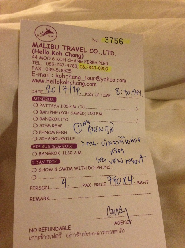 因为码头有卖回曼谷 的车票,我们就顺便买了。包象岛 酒店接送,包船票,一共是每人750thb。