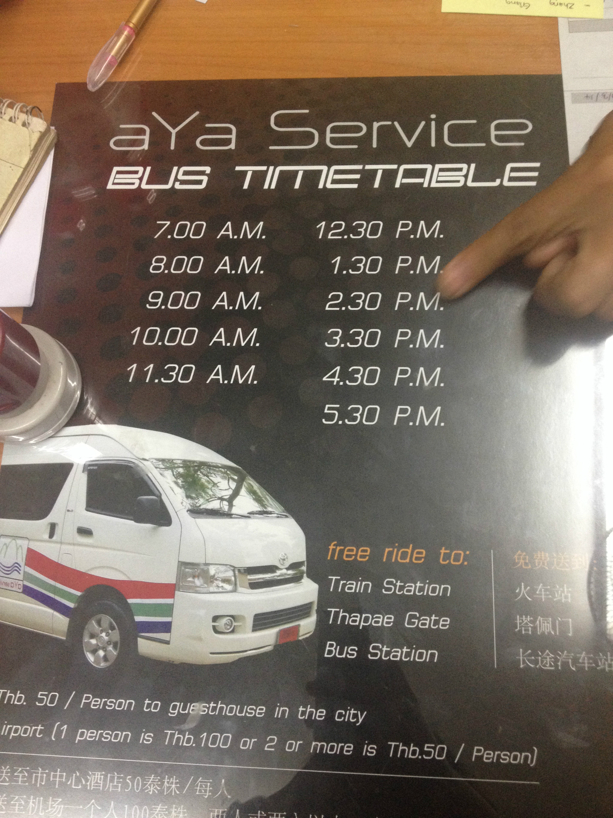 这个是AYA公司从拜县 去清迈 的发车时间表,建议大家在到达拜县 的当天就把回程的票买了~
