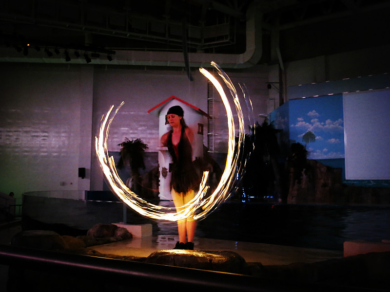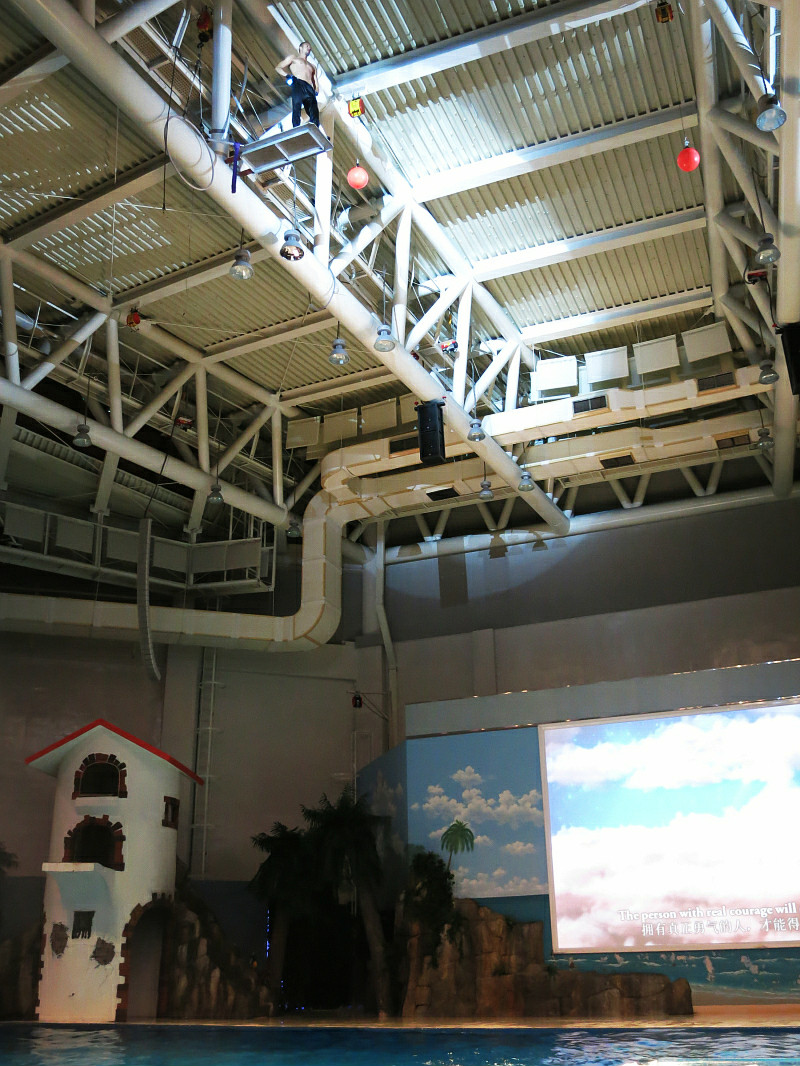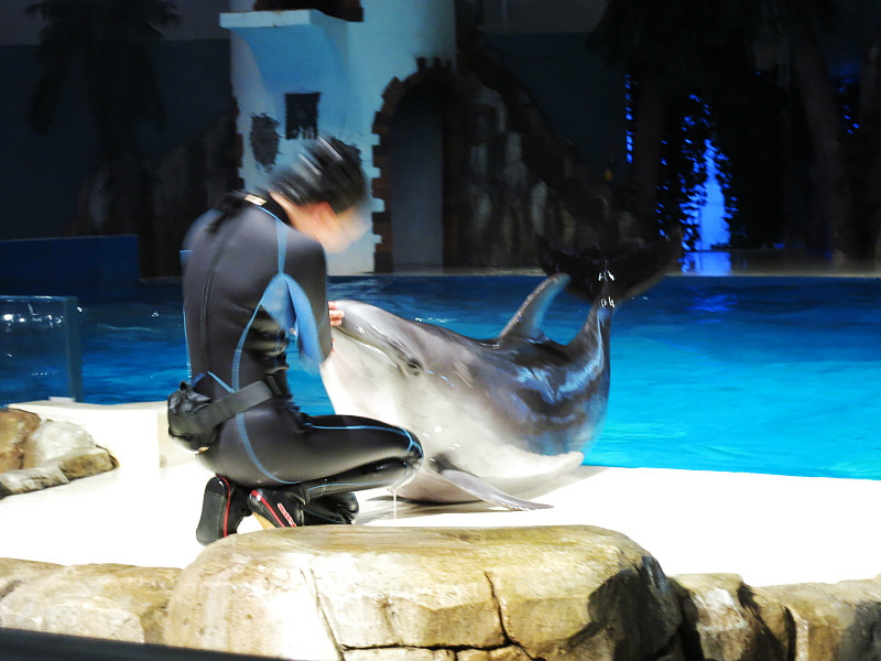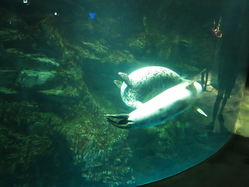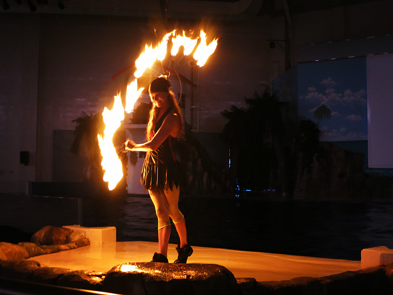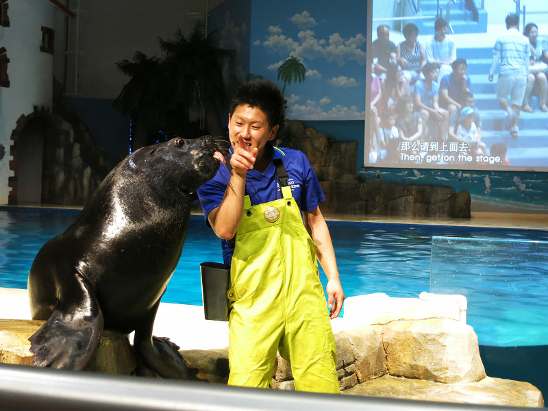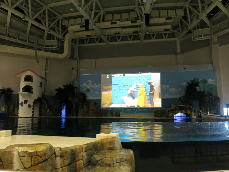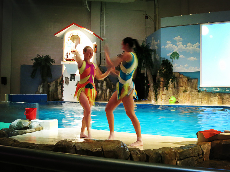 在下午1点,海洋馆的剧场里面有表演。表演分两部分,第一部分是真人秀,大概就是花样游泳、高空杂技和高台 跳水表演, 第二部分是动物表演,有海豹和海豚,还有现场互动环节,大概1个小时。