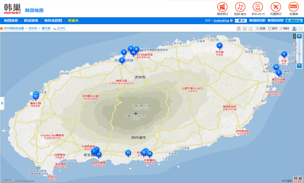 这个地图非常方便,可以用中文输入,查询相应的韩文,只是没有手机客户端。导航路线只有出租车和地铁,没有公交,出租车价钱不是很准确。注册一个用户名,就可以用收藏夹这个功能了,搜索到要去的地方,然后收藏,查看收藏夹的时候,就可以显示该页所有的地点相对的位置(如下图),根据景点的远近,方便制定行程。