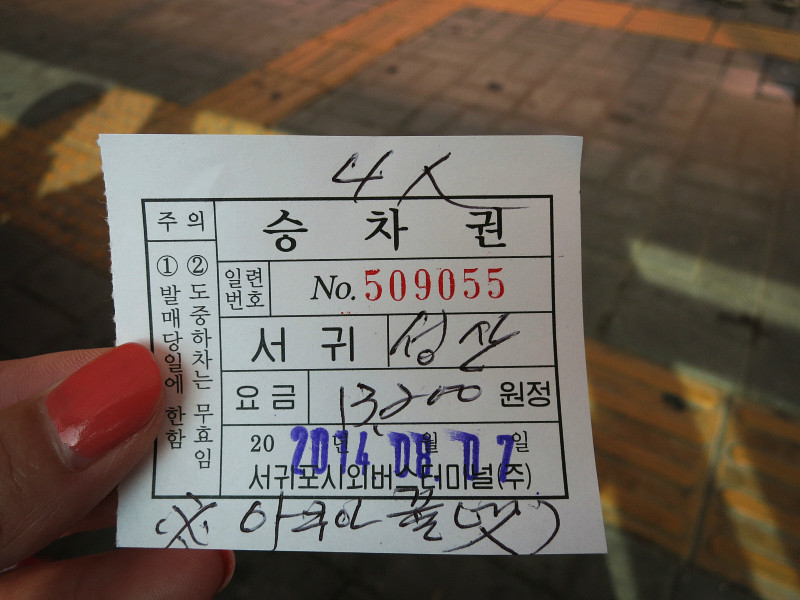 去翰林公园 的车票,完全看不懂。 长途车在几个大站都有韩、英、中、日四语的报站。每个公交站都有中文的站名,车前的电视上还会显示相对的车站名,如果用naver map事先查好哪站下,定好位,不会错过站的。