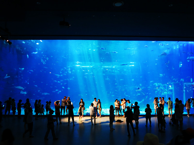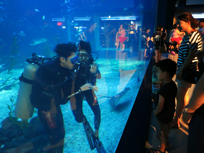 之前有一个说明会,结束后游客纷纷和大水族箱合影,然后看到有潜水的人