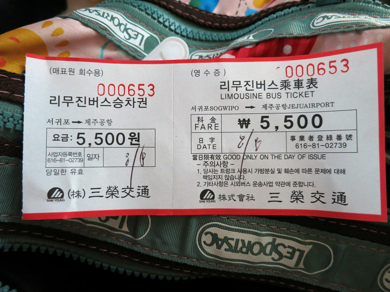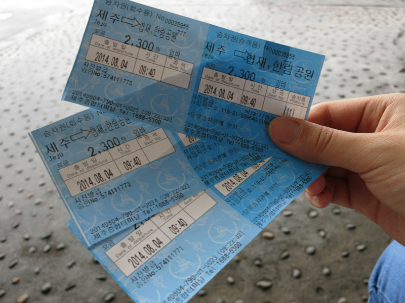 济州市长途客运站(Bus Terminal)长途车分为东线和西线,可以窗口购票,也可用TM卡。窗口购票可以问清楚几点和几站台,比较清楚。长途车的票价不同,分为1300,1800,2300,2800,3300几个价位的。