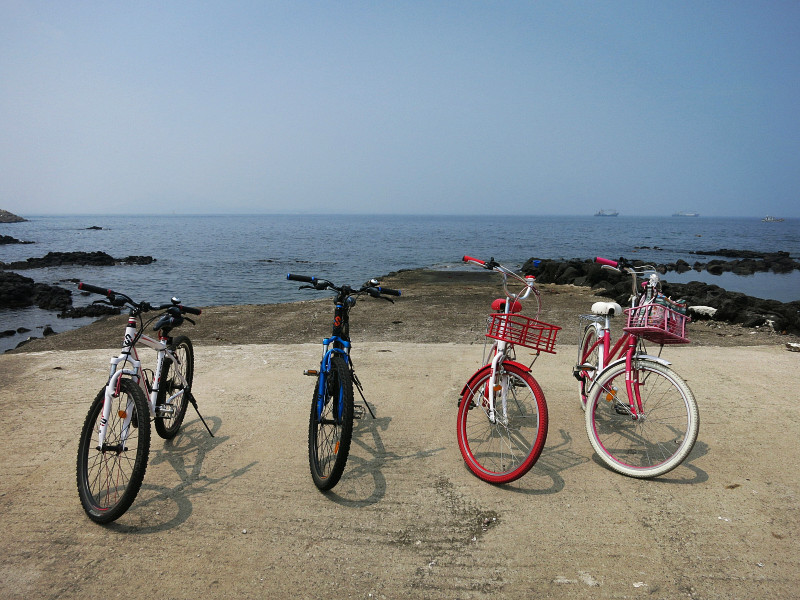 上岛上第一件事就是租车,有很多家店,价位差不多。租四轮、三轮、两轮的摩托车均需要国际驾照,我们只能租自行车。普通自行车每车3小时1万韩元,电动自行车每车3小时2万韩元,可以绕岛一周了。但是每个景点就不能停留很长时间,观光时间是够的。这里的电动自行车和我们常见的电瓶车不太一样,长相和普通车没什么差异,不知道电动在哪里。