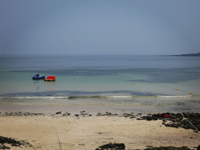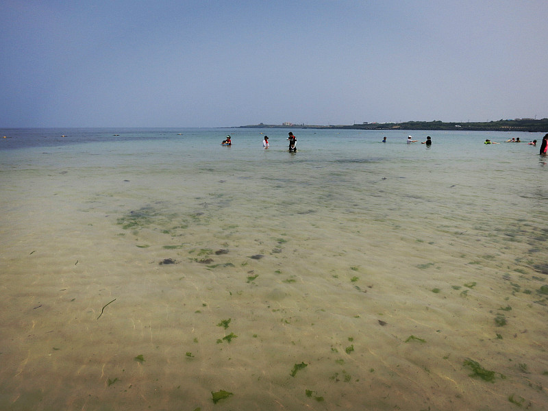 这是一个海水浴场,海水被太阳晒得很暖和,沙子也细细的,就是海草太多。