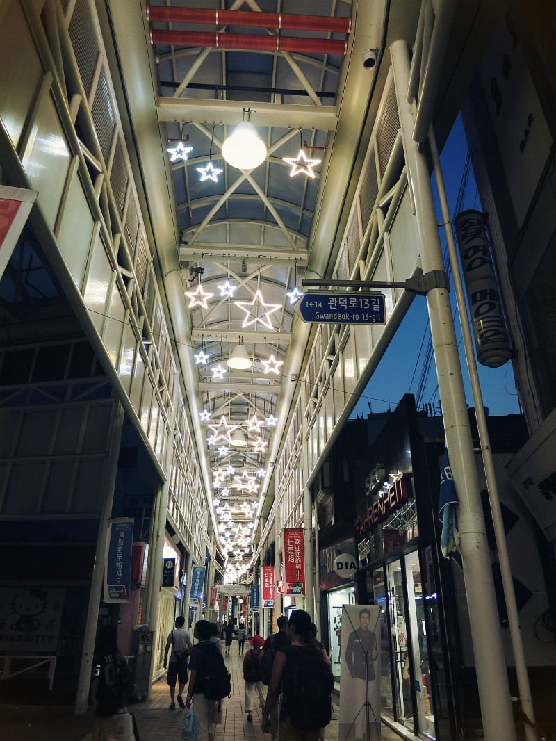 地下街上来,还有一条很长的街,叫七星街 ,房顶上有星星灯的装饰,两边也是商店,几乎每家店都有中国 导购,或者会说中文的导购,可以刷银联卡,超过3万韩元可以退税。总之,各种购物,是happy shopping time。