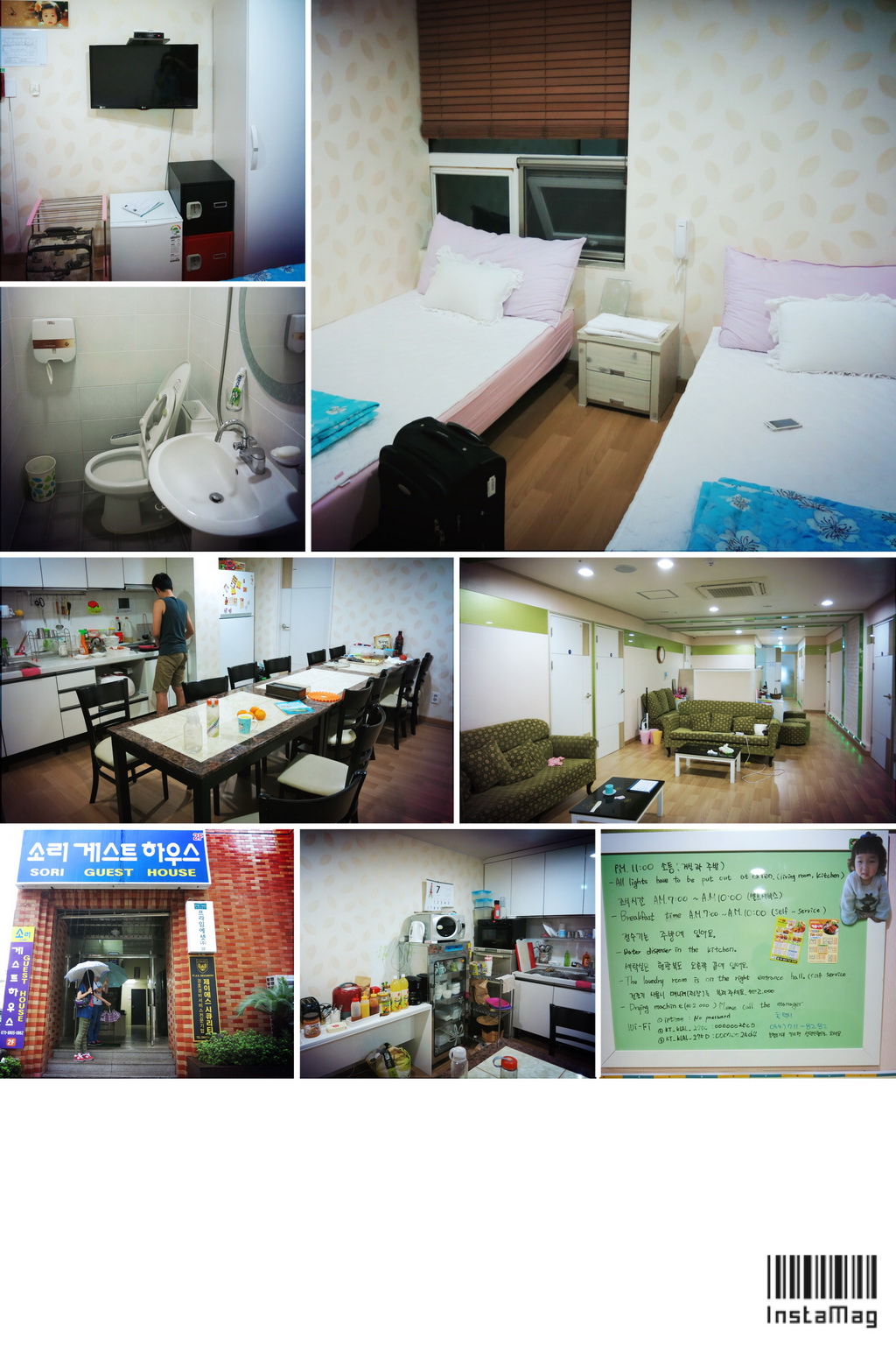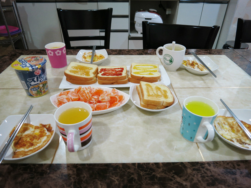 我们预定的是苏里宾馆 (Sori Guesthouse),离机场大约4公里,很近,但是出租车司机不知道路。拿出Pad给司机看导航,可是司机老花眼,根本看不清。司机打电话询问了半天,总算是知道了大概位置。到了街上又寻么了半天,差点儿找错了,几经周转终于安全入住。宾馆在一个建筑的2层,很小,但是布置很温馨,大概有10间左右的房间,有背包客式的上下铺,也有标准的双床间,基本上全是韩国 人。房间也很小,但是该有的都有,还有冰箱、保险柜。早餐是在公用的dining room,自助式,自己煎鸡蛋、烤面包、泡咖啡、泡泡面……总之,非常丰盛。