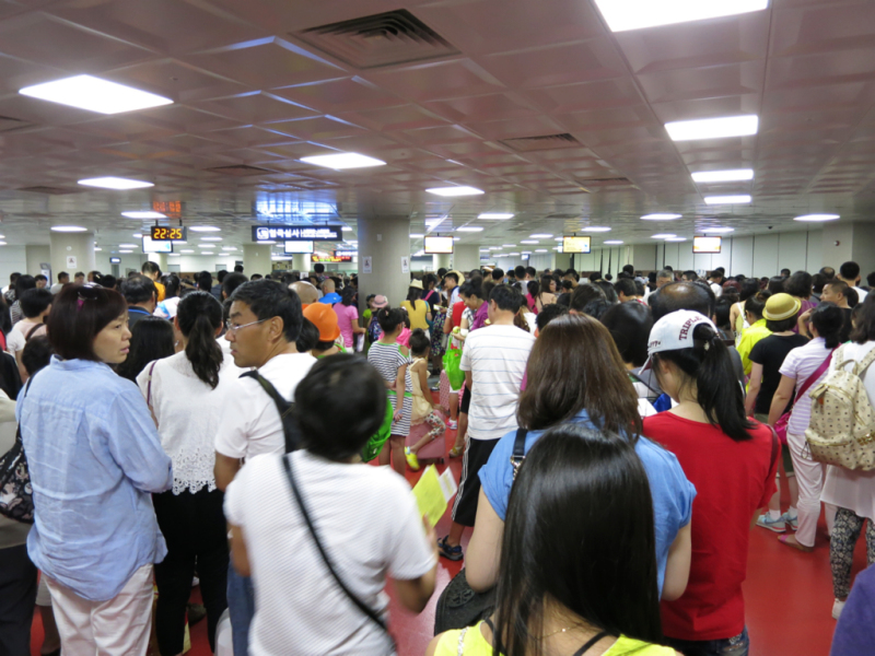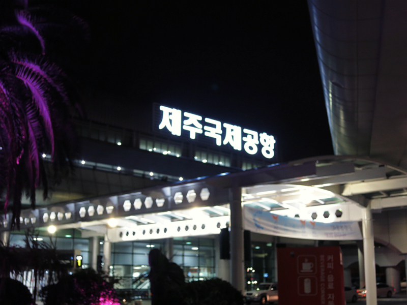 提前2个小时到达首都机场T3航站楼,办理登机、安检,飞机起飞有些迟,大概晚了半个小时。到达济州岛 的时候已经晚上10点了,没想到办理入境的人如此之多,99%都是中国 人啊,各种旅行团啊。排队入关时需要填写两张单子,一张是飞机空姐发的,大概是携带物品的,一张是入关的,需要到旁边的柜台自己领取。入关检查要按指纹,据说是因为韩国 整容的太多,光靠面部拍照识别不了了。