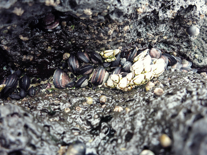 岩石缝中有很多贝类小生物,还有螃蟹可以抓。