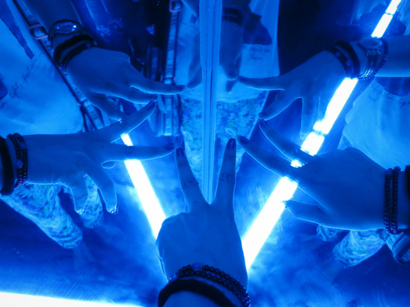 表演开场前,观众席前的摄像头会在现场搜索带着小朋友的家庭和情侣,映在大屏幕上,做成大头贴的样子,可以拍照。
