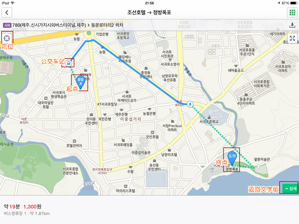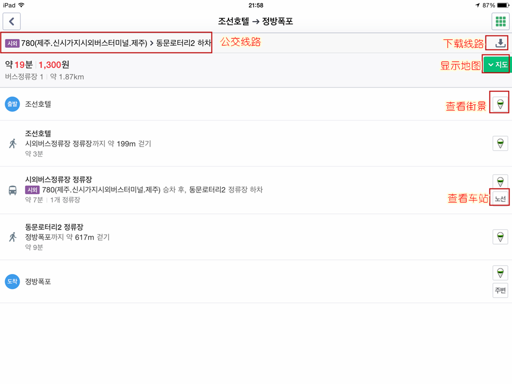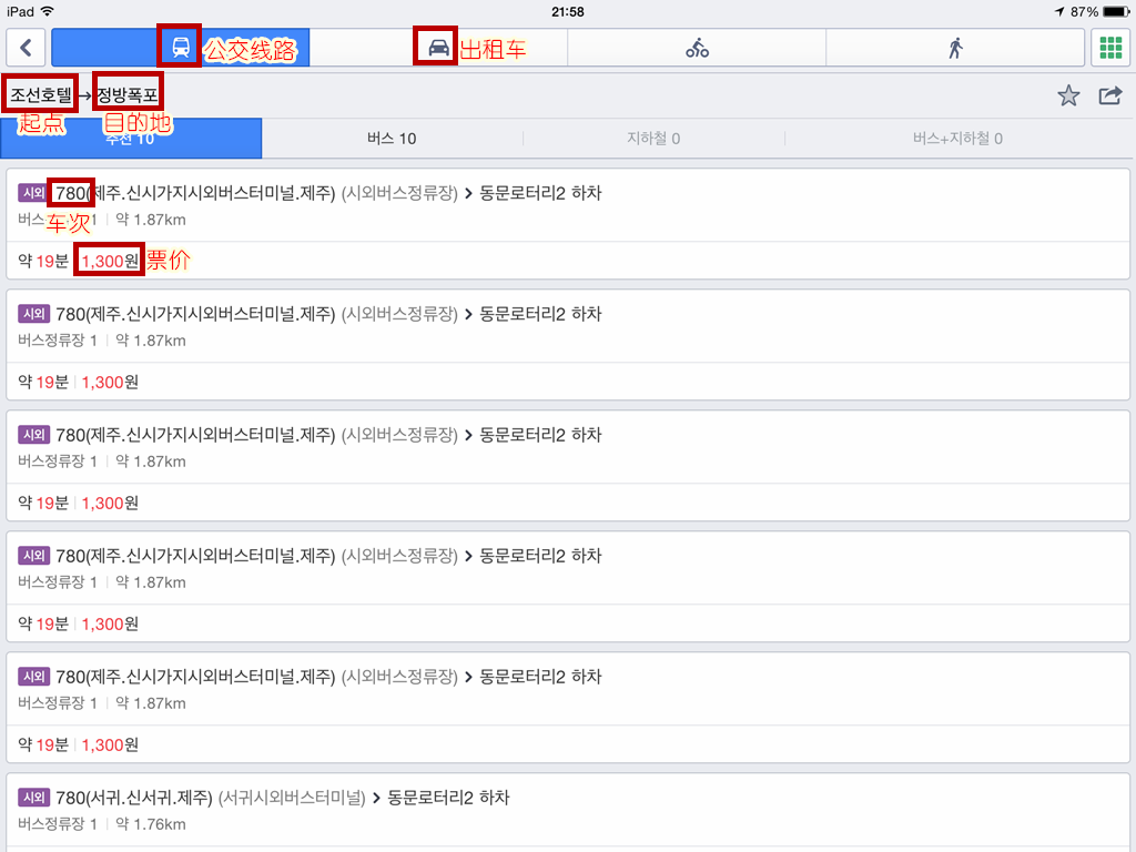 点查询路线中,输入起点和终点的韩文,选择公交或出租,会出现相应的线路,还有价格。