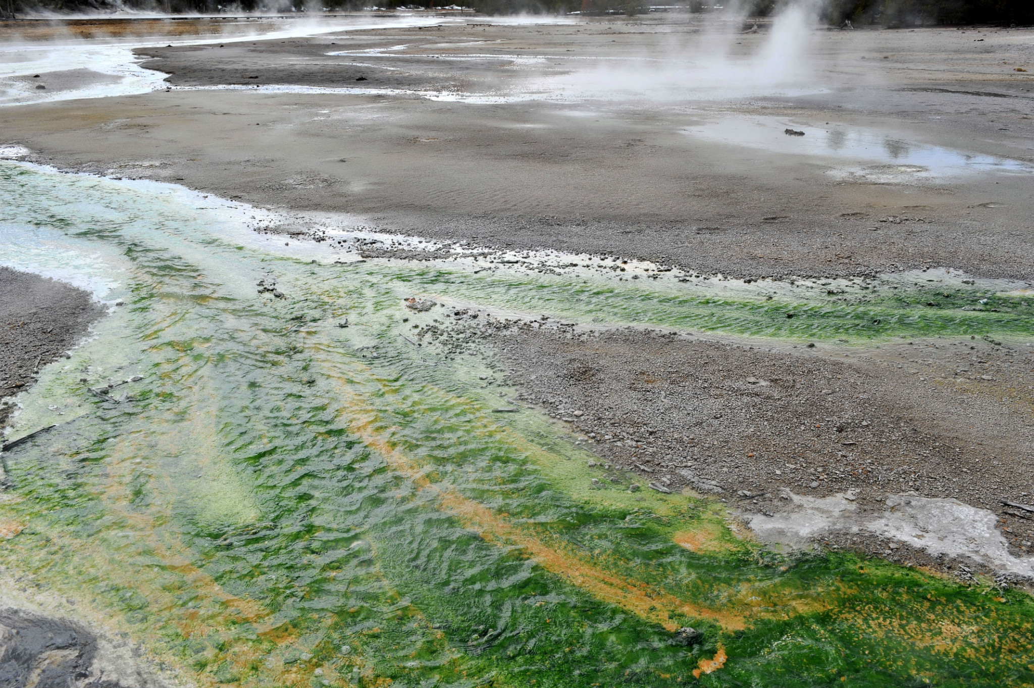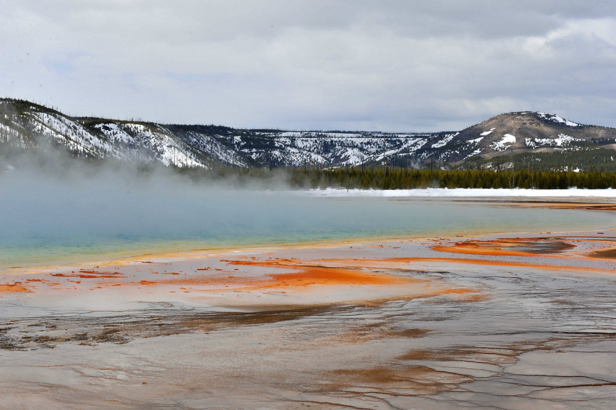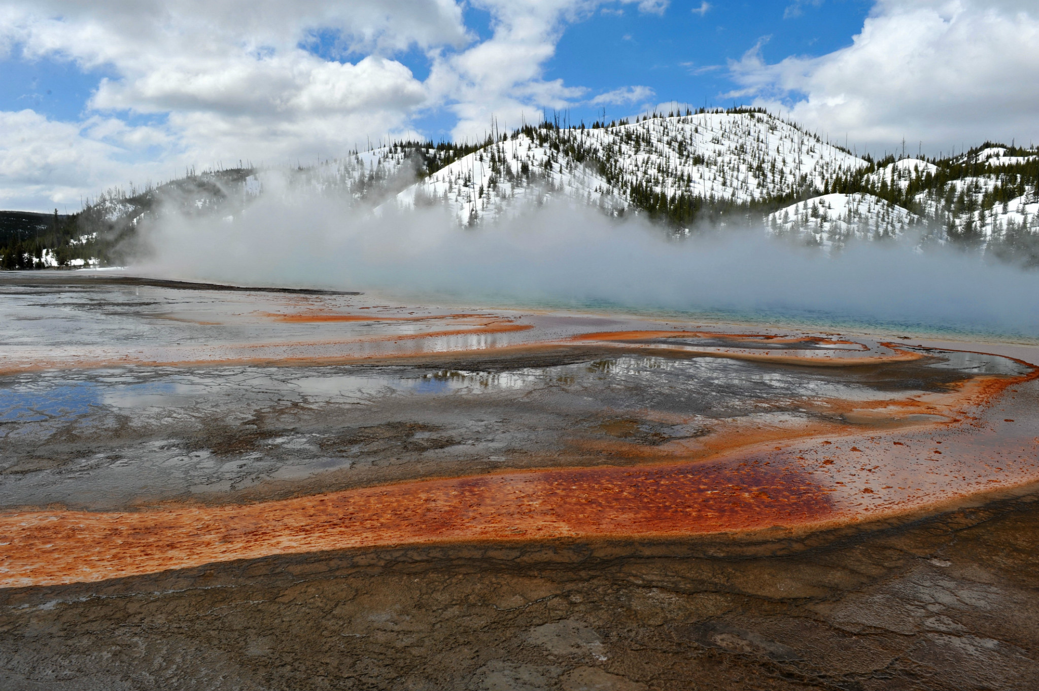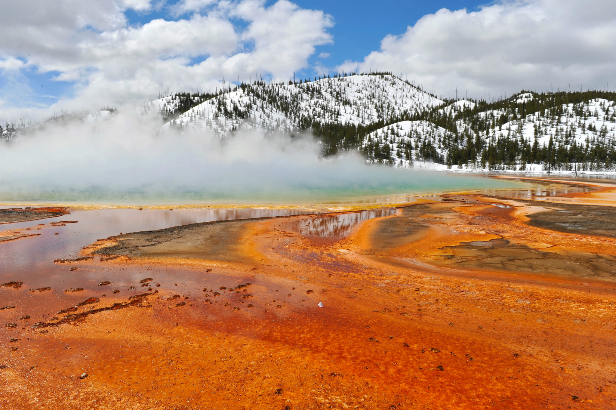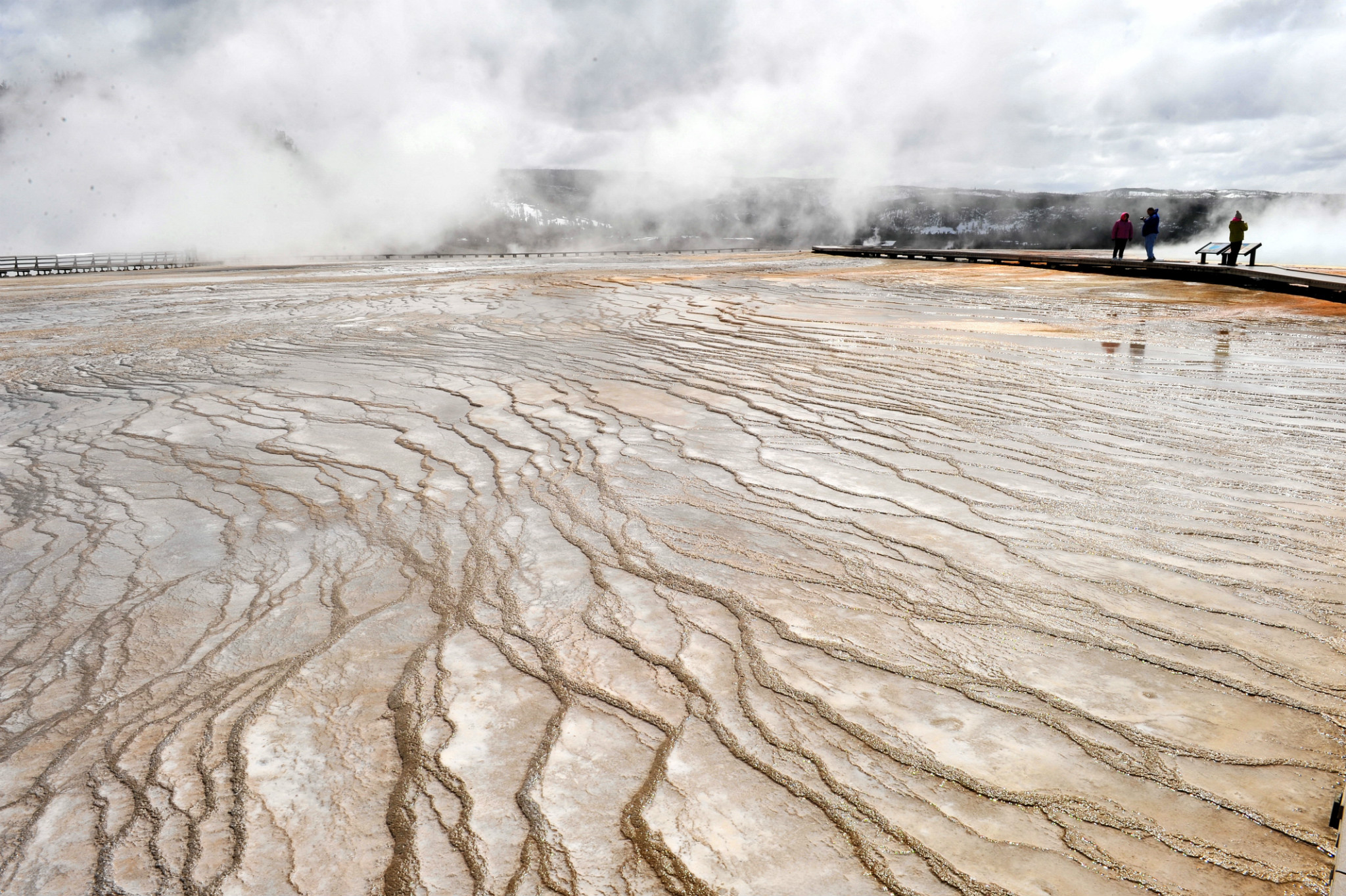 刚进园时看到大群的美洲野牛,还有母牛给小牛哺乳的场景。上午去麦迪逊 宿营地,有印第安人战争地遗迹。之后去下间歇泉游览,特点为松树树干钙化。上午主要游览黄石 公园最著名的大棱镜温泉(The Grand Prismatic Spring),是美国 最大,世界第三大的温泉。它宽约75至91米,49米深,每分钟大约会涌出2000公升,温度为71°C左右的地下水。大棱镜温泉湖面颜色从绿色变为灿烂的橙红色,这是由于富含矿物质的水体中生活着的藻类和含色素的细菌等微生物, 类胡萝卜素的比例会随季节变换而改变,于是水体也就呈现出不同的色彩。在夏季,叶绿素含量相对较低,显现橙色、红色,或黄色。但到了冬季,由于缺乏光照,这些微生物就会产生更多的叶绿素来抑制类胡萝卜素的颜色,于是就看到水体呈现深绿色。景区内云雾缭绕、绚丽多姿,世间奇迹,美不胜收。