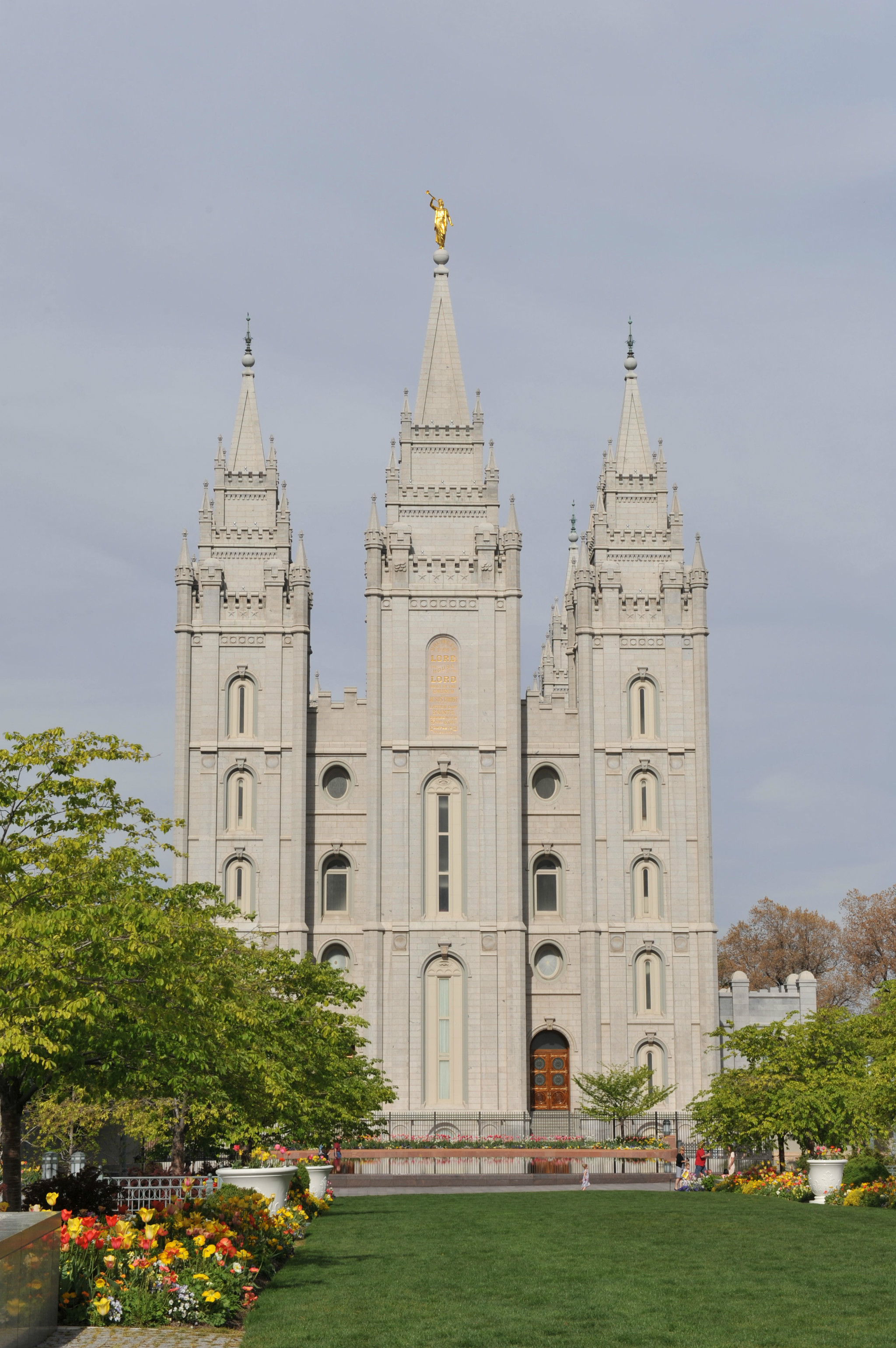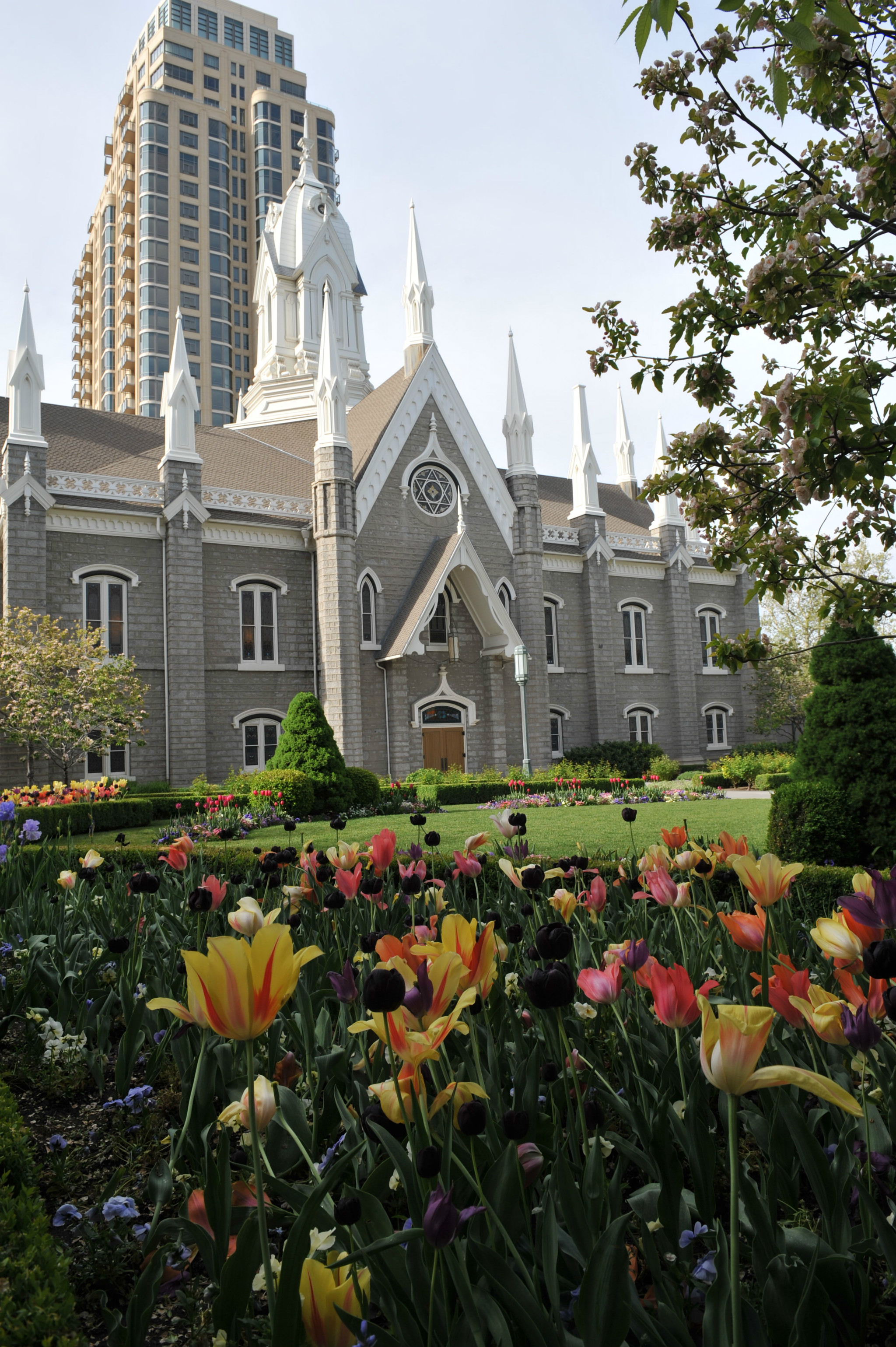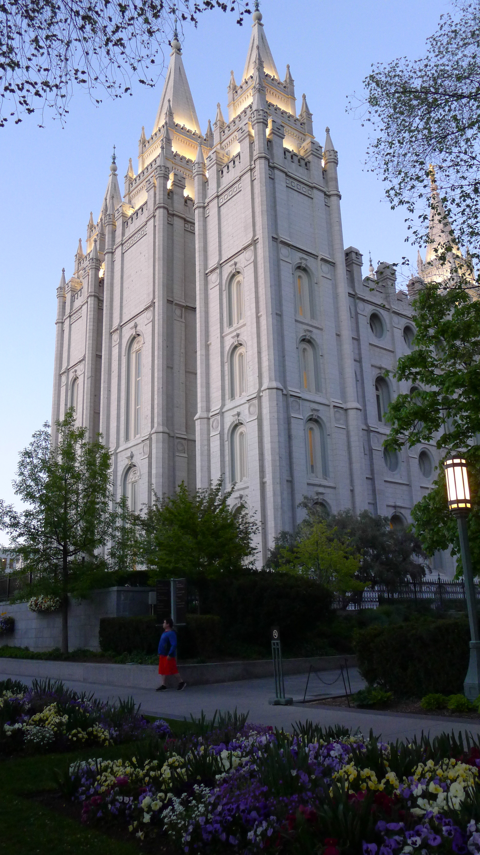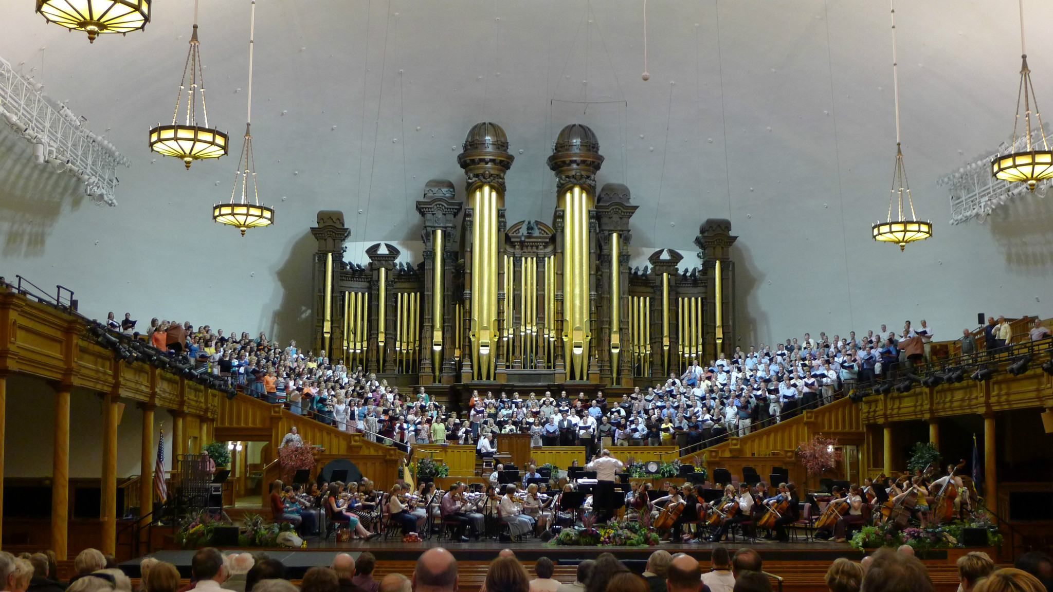 )。我们本打算去逛逛最大的商场,沿着马路,欣赏市中心街道大气的规划和开满各色郁金香的花坛。不觉中来到摩门教堂 广场。教堂广场是摩门教会的圣殿,也是犹他州 最知名的旅游胜地。既来之,则安之,随着人流进入摩门会堂。摩门会堂是世界上最大的圆顶、无柱拱门建筑,可容纳8000多人集会,拥有能容纳千人的大舞台,舞台上藏着镇堂之宝--有10000多个管制组成的管风琴。没想到我们运气非常好,舞台上摩门教合唱团正在排练音乐。合唱团人员非常多,分成三大组,为半专业的,大家听从指挥,反复视唱,声音此起彼伏,场面高雅。