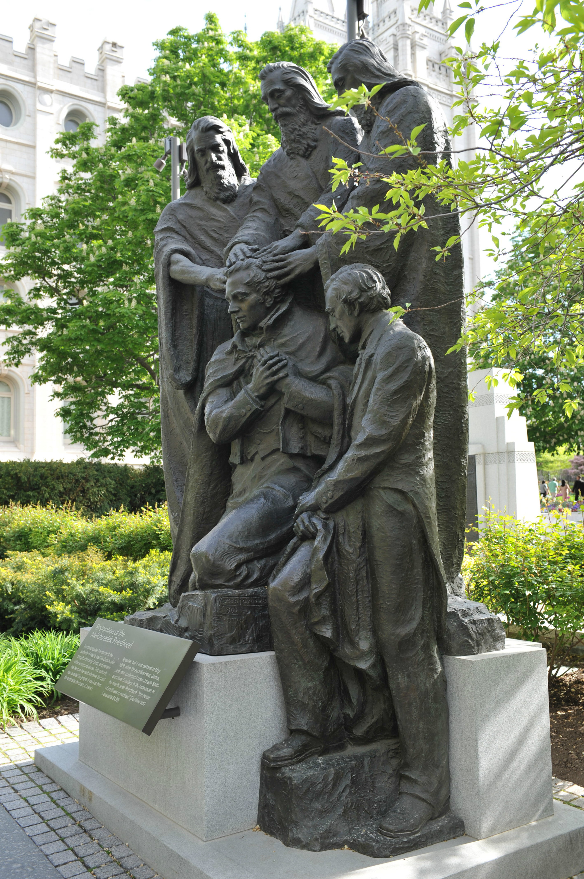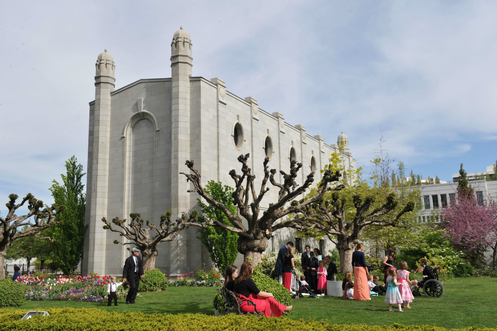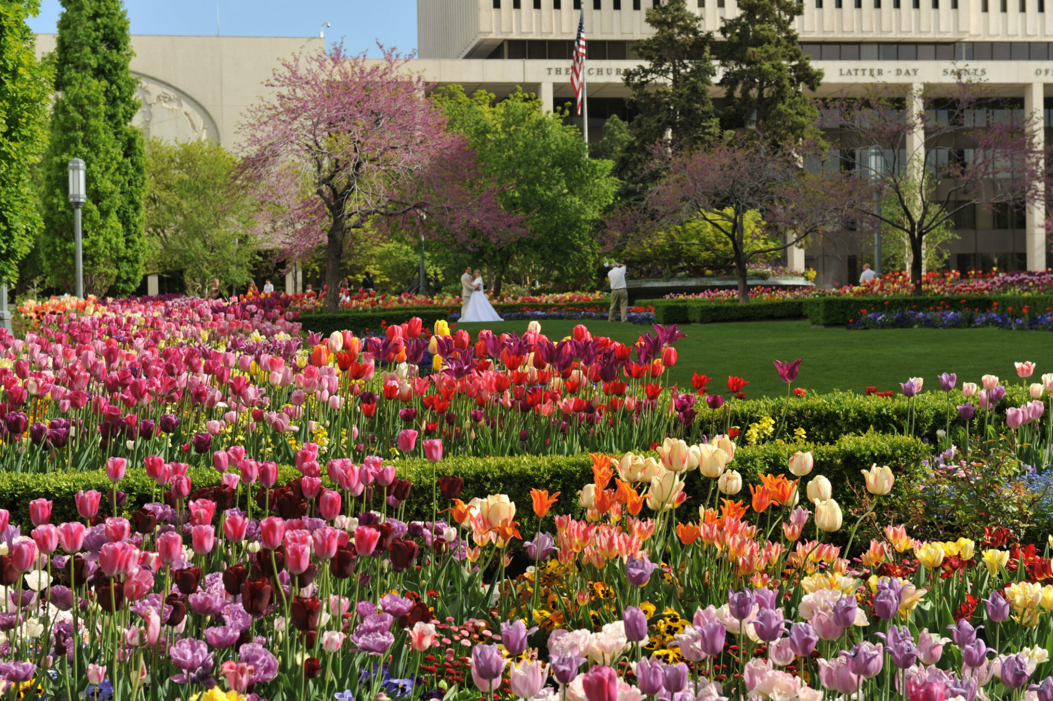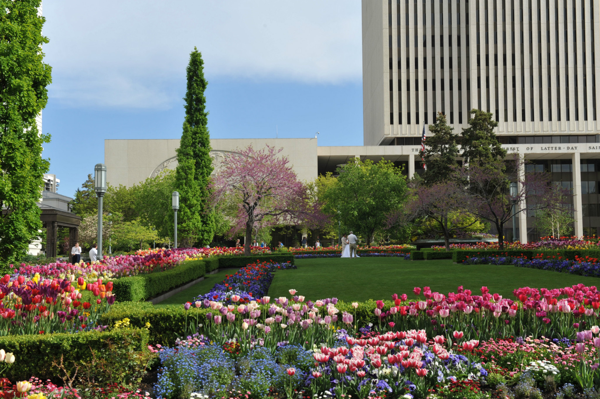 )。我们本打算去逛逛最大的商场,沿着马路,欣赏市中心街道大气的规划和开满各色郁金香的花坛。不觉中来到摩门教堂 广场。教堂广场是摩门教会的圣殿,也是犹他州 最知名的旅游胜地。既来之,则安之,随着人流进入摩门会堂。摩门会堂是世界上最大的圆顶、无柱拱门建筑,可容纳8000多人集会,拥有能容纳千人的大舞台,舞台上藏着镇堂之宝--有10000多个管制组成的管风琴。没想到我们运气非常好,舞台上摩门教合唱团正在排练音乐。合唱团人员非常多,分成三大组,为半专业的,大家听从指挥,反复视唱,声音此起彼伏,场面高雅。