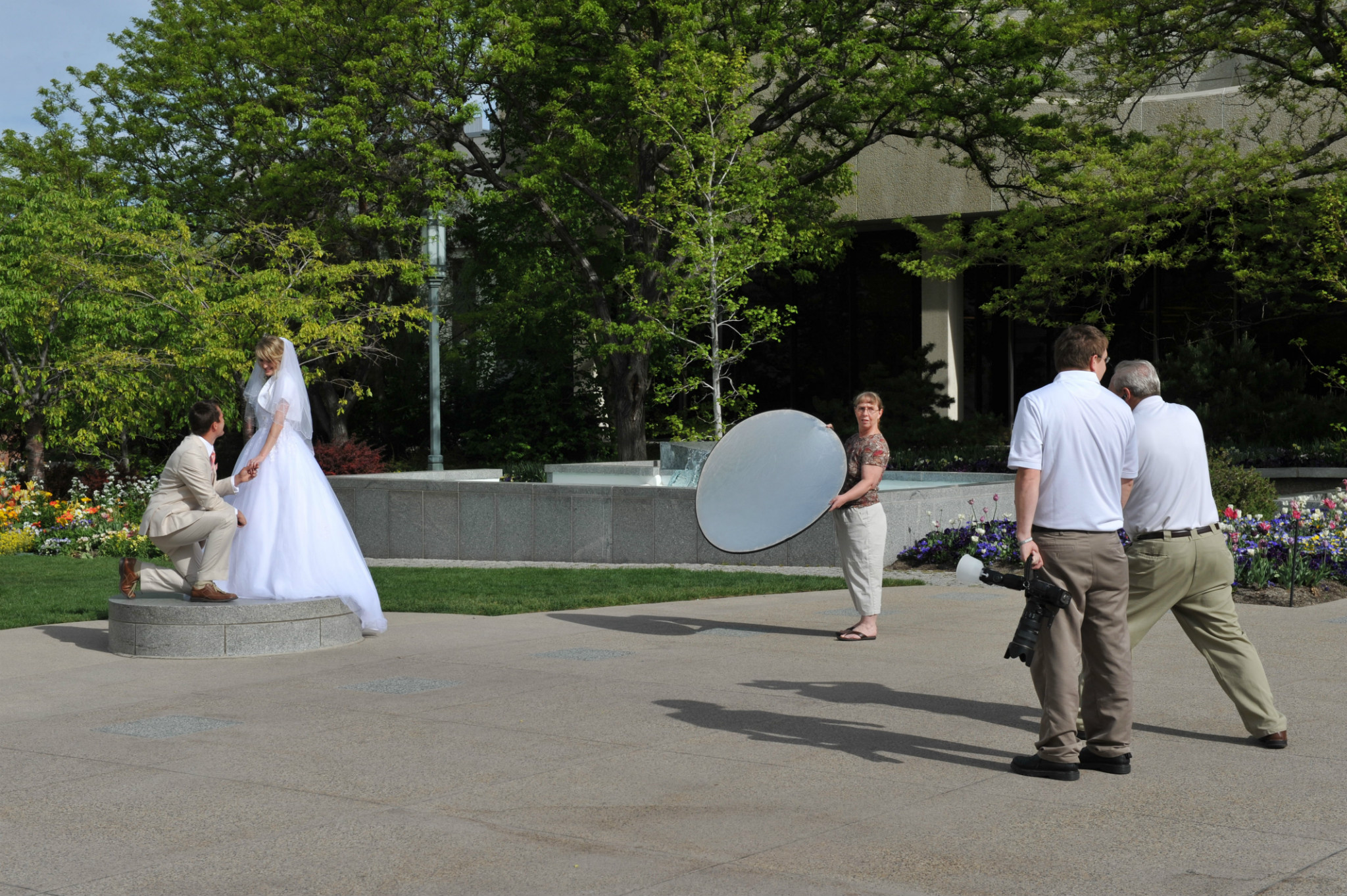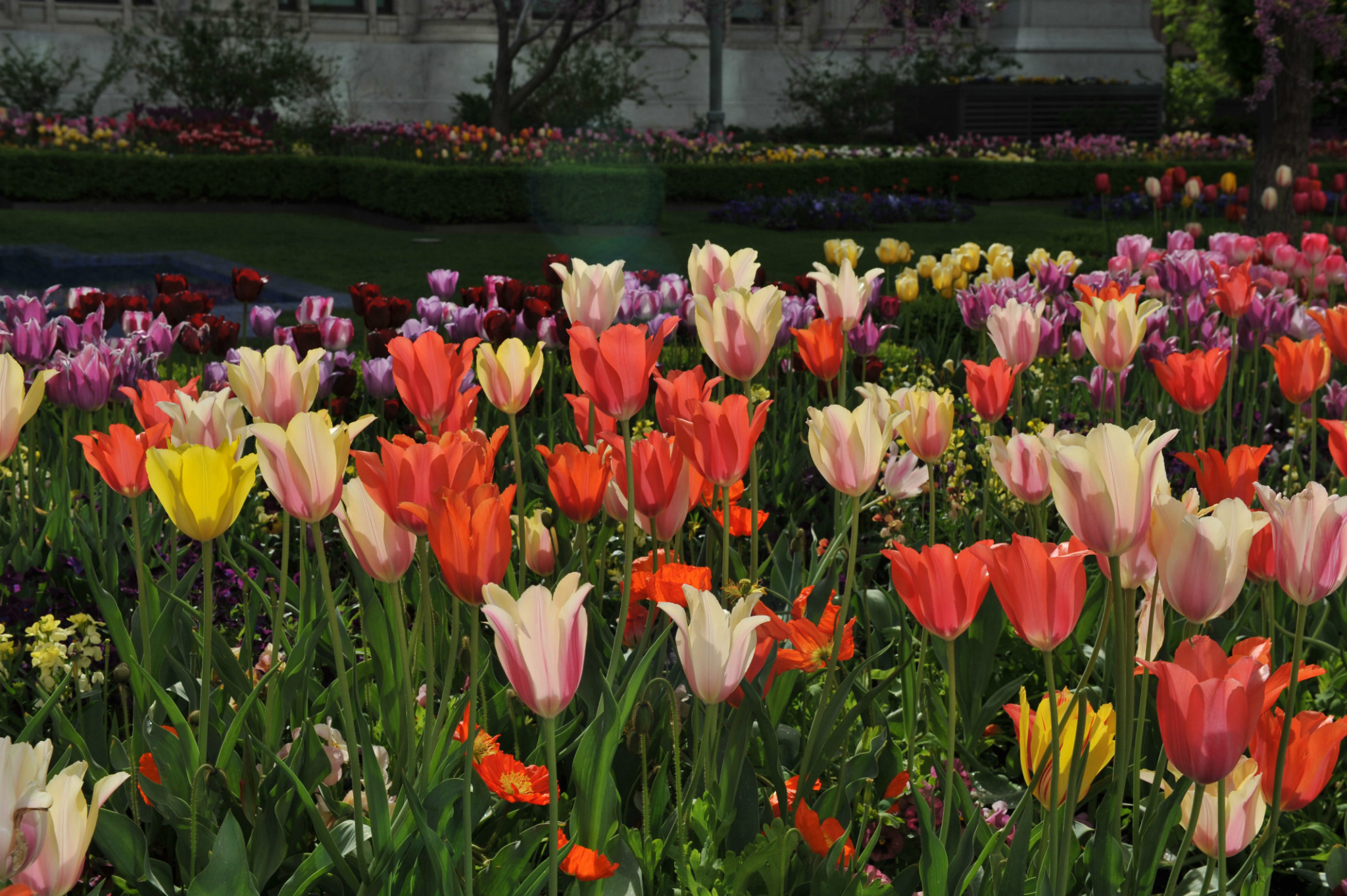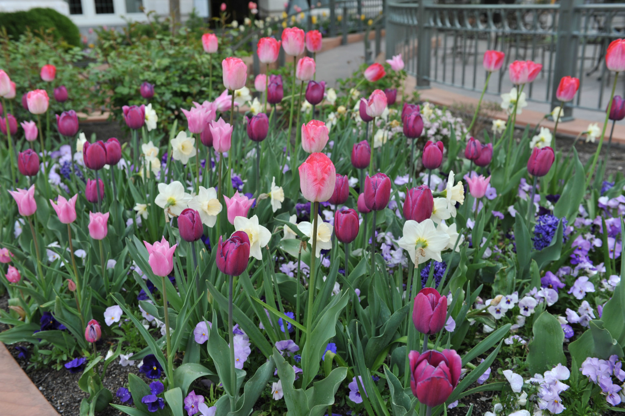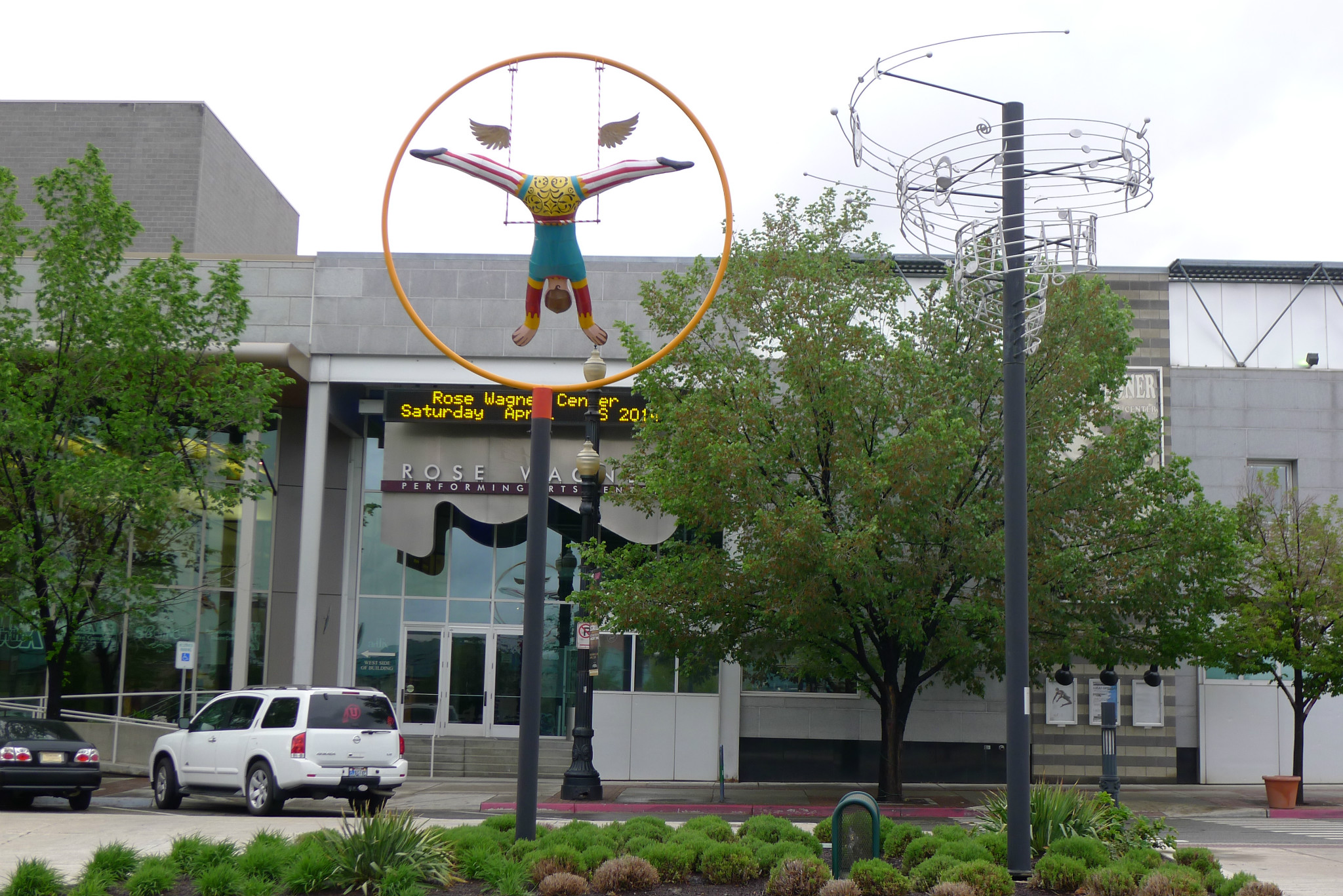 )。我们本打算去逛逛最大的商场,沿着马路,欣赏市中心街道大气的规划和开满各色郁金香的花坛。不觉中来到摩门教堂 广场。教堂广场是摩门教会的圣殿,也是犹他州 最知名的旅游胜地。既来之,则安之,随着人流进入摩门会堂。摩门会堂是世界上最大的圆顶、无柱拱门建筑,可容纳8000多人集会,拥有能容纳千人的大舞台,舞台上藏着镇堂之宝--有10000多个管制组成的管风琴。没想到我们运气非常好,舞台上摩门教合唱团正在排练音乐。合唱团人员非常多,分成三大组,为半专业的,大家听从指挥,反复视唱,声音此起彼伏,场面高雅。