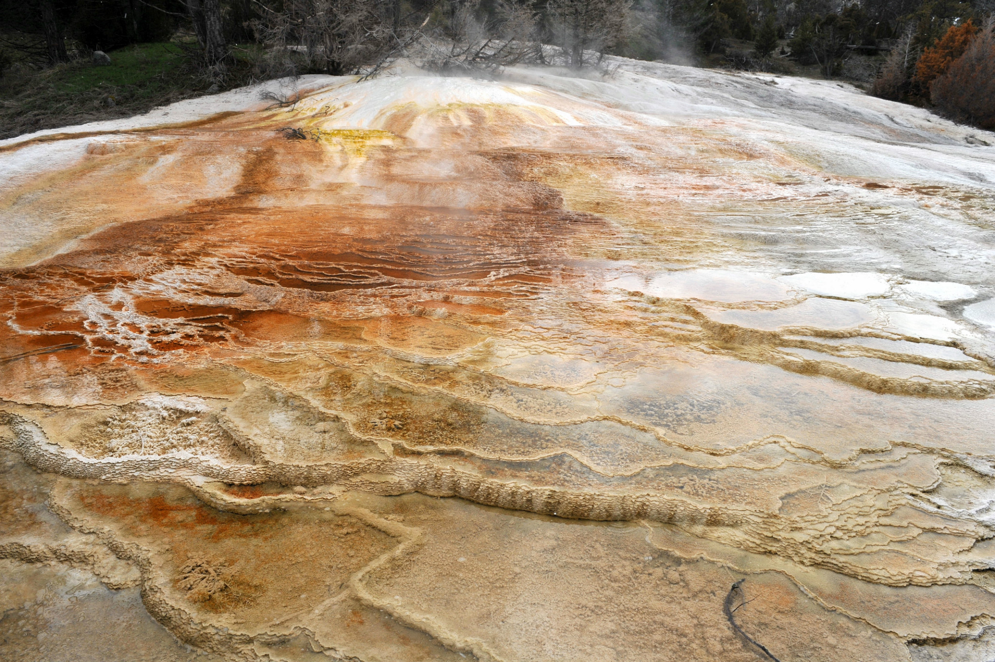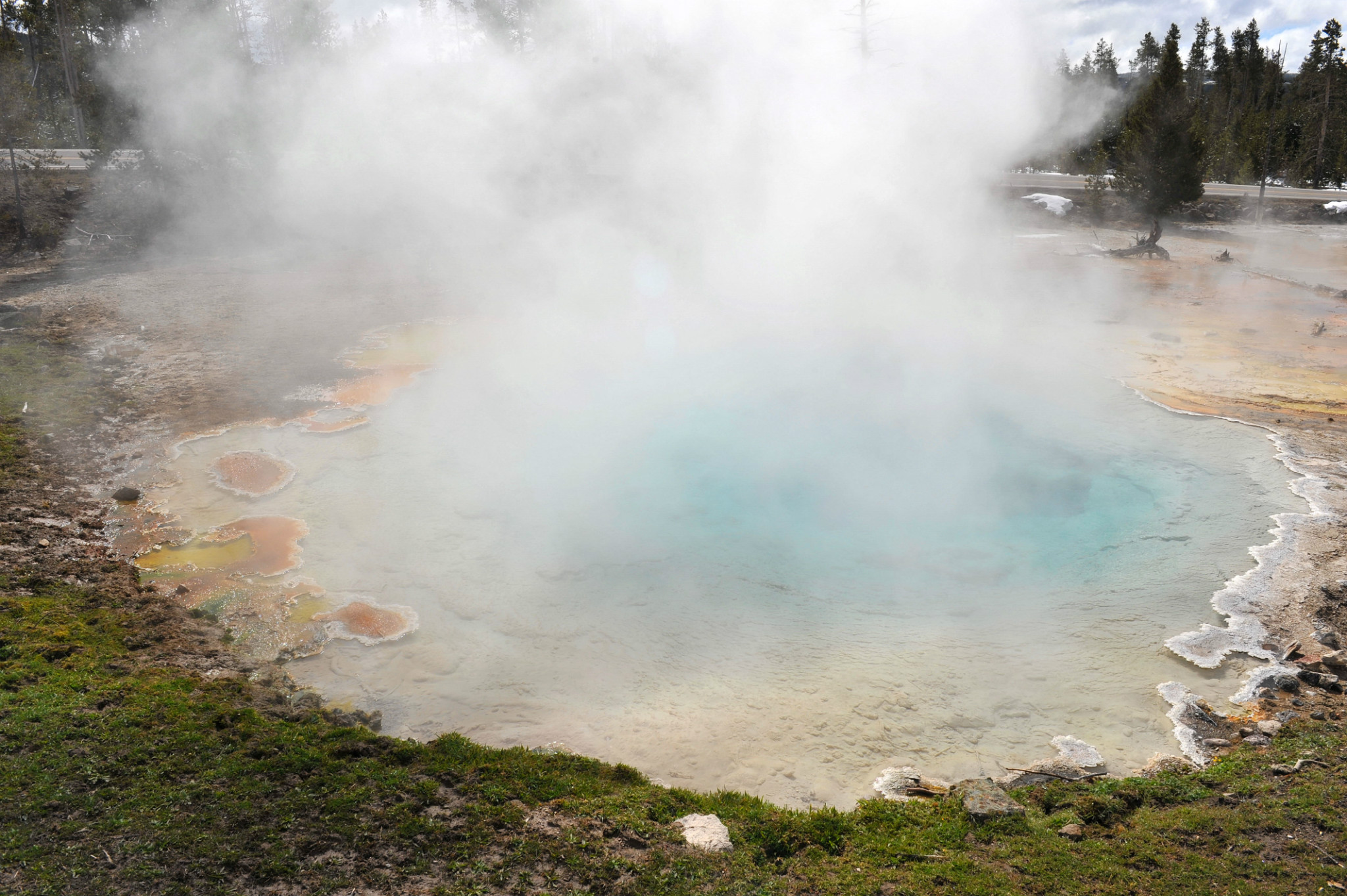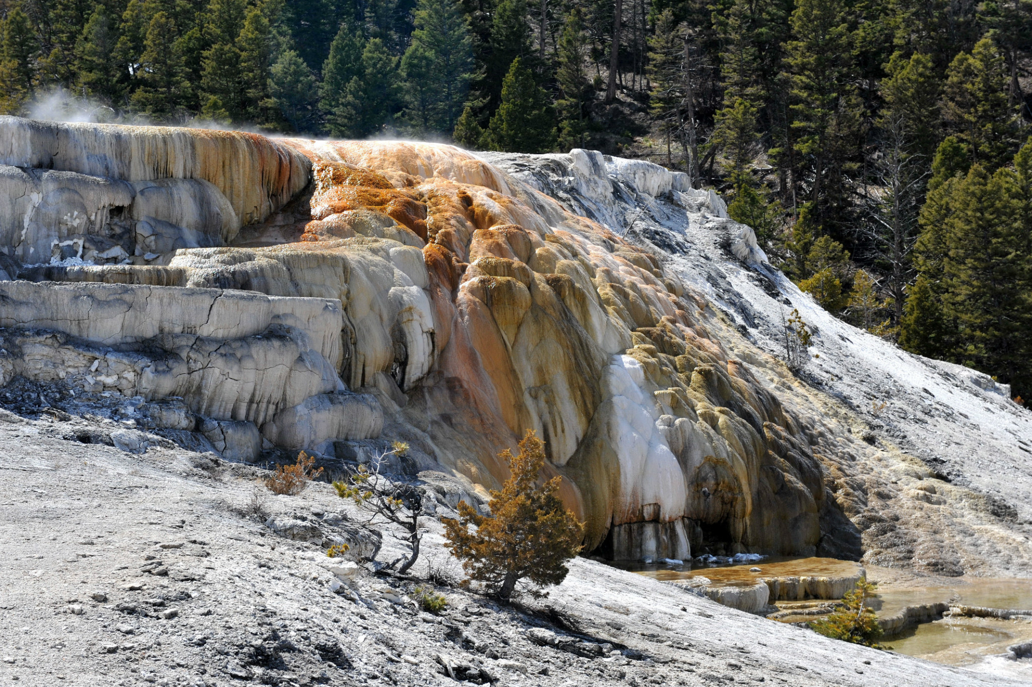 下午游览猛犸象热泉,是世界上已探明的最大的碳酸盐沉积温泉。有金丝鸟景区。其景观以石灰石台 阶为主,也称热台阶区,可分为上台地(UpperTerraces)和下台地(Lower Terraces)。猛犸象(Mammoth Hot Spring)原有多个热泉从山坡上一节一节地流下来,滋生了大量细菌,成为了一个色彩丰富的阶梯,但是在2002年的一次地壳运动后,大部分热泉停止了活动,导致大量微生物死亡,使猛犸象热泉失去了颜色,死掉的细菌也变为了灰白色的粉末,残留在乾枯了的大台阶上。又游览间隔泉,景区内泉眼多,一边是泉眼喷发,一边是厚的积雪不化。景区云雾缭绕,颜色绚丽,硫磺气味浓郁,感悟大自然的鬼斧神工,神秘莫测。