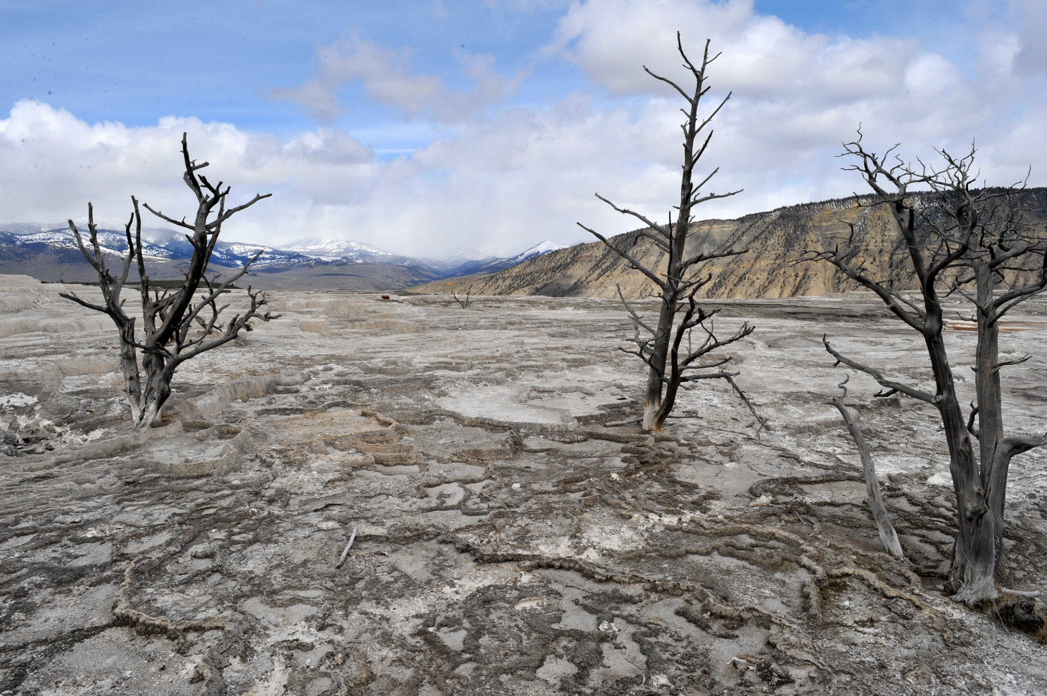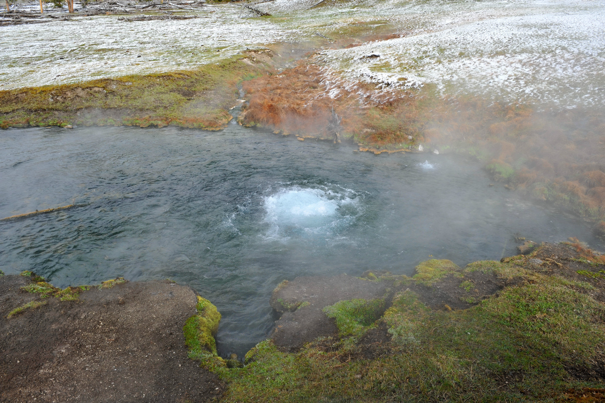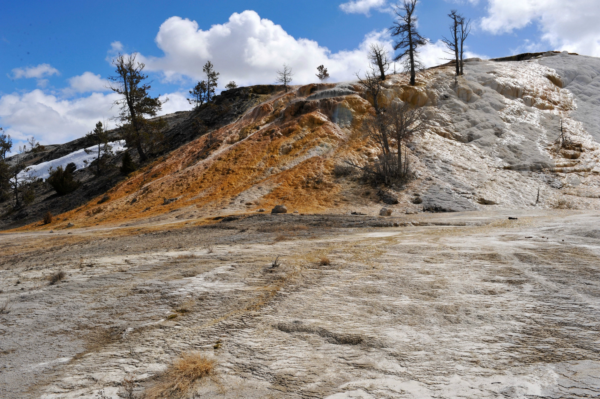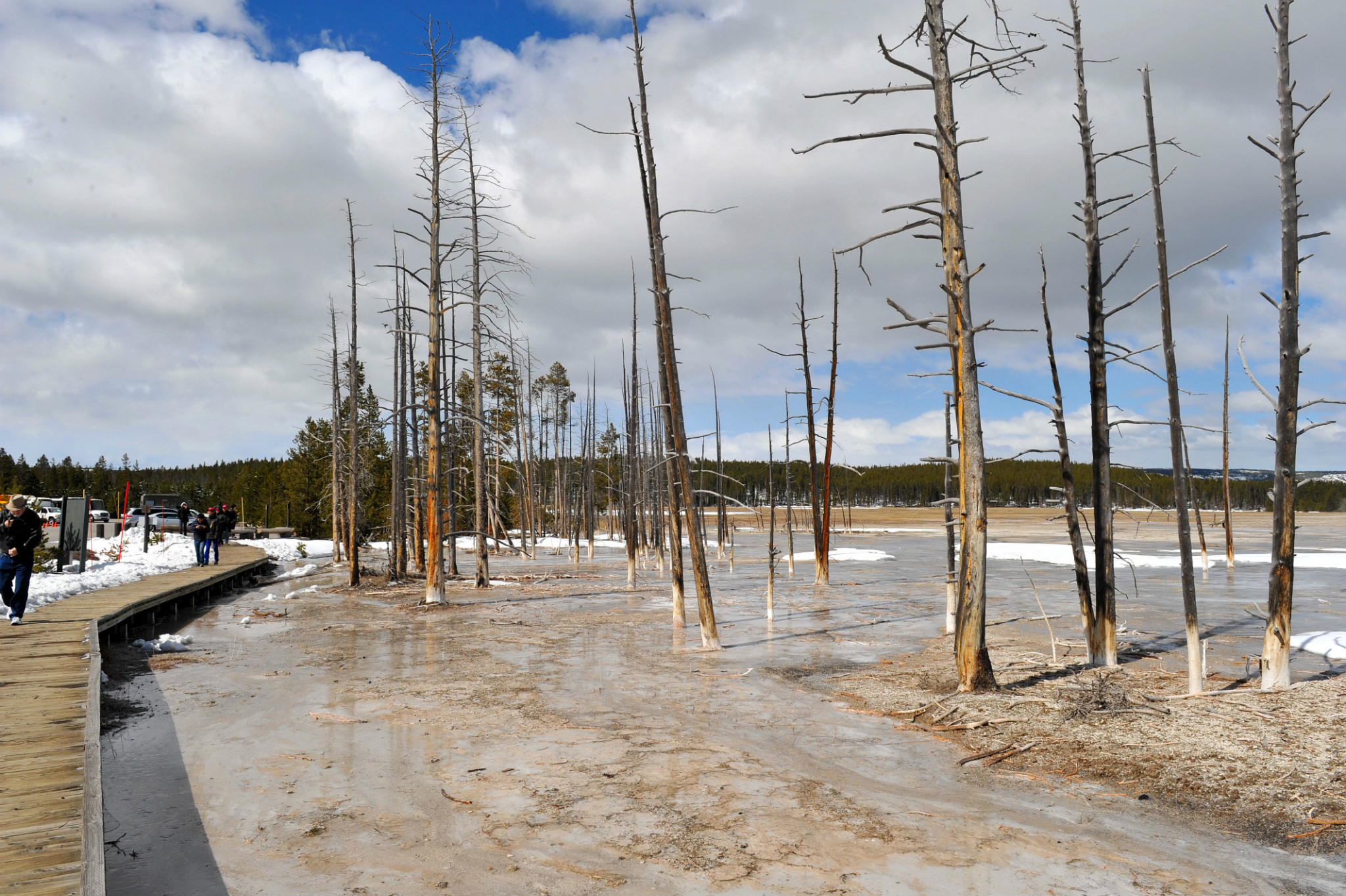 下午游览猛犸象热泉,是世界上已探明的最大的碳酸盐沉积温泉。有金丝鸟景区。其景观以石灰石台 阶为主,也称热台阶区,可分为上台地(UpperTerraces)和下台地(Lower Terraces)。猛犸象(Mammoth Hot Spring)原有多个热泉从山坡上一节一节地流下来,滋生了大量细菌,成为了一个色彩丰富的阶梯,但是在2002年的一次地壳运动后,大部分热泉停止了活动,导致大量微生物死亡,使猛犸象热泉失去了颜色,死掉的细菌也变为了灰白色的粉末,残留在乾枯了的大台阶上。又游览间隔泉,景区内泉眼多,一边是泉眼喷发,一边是厚的积雪不化。景区云雾缭绕,颜色绚丽,硫磺气味浓郁,感悟大自然的鬼斧神工,神秘莫测。