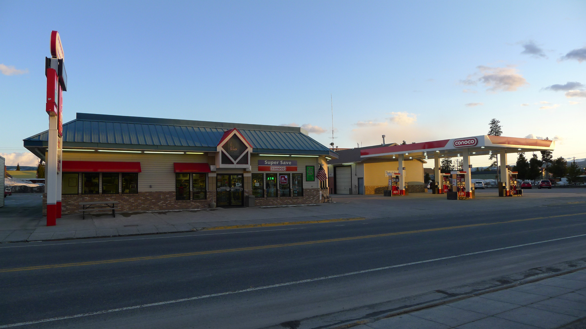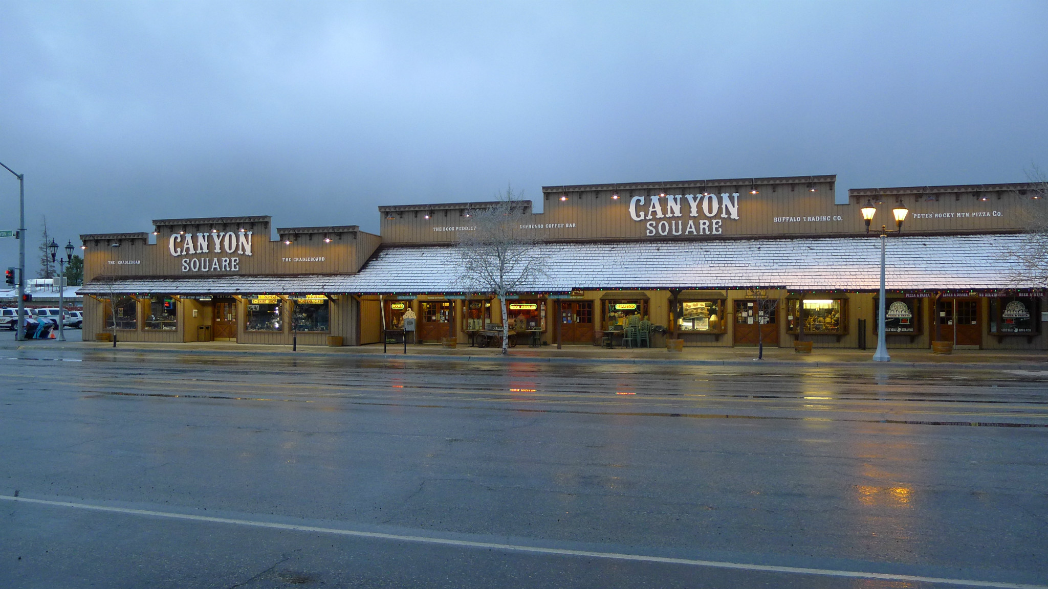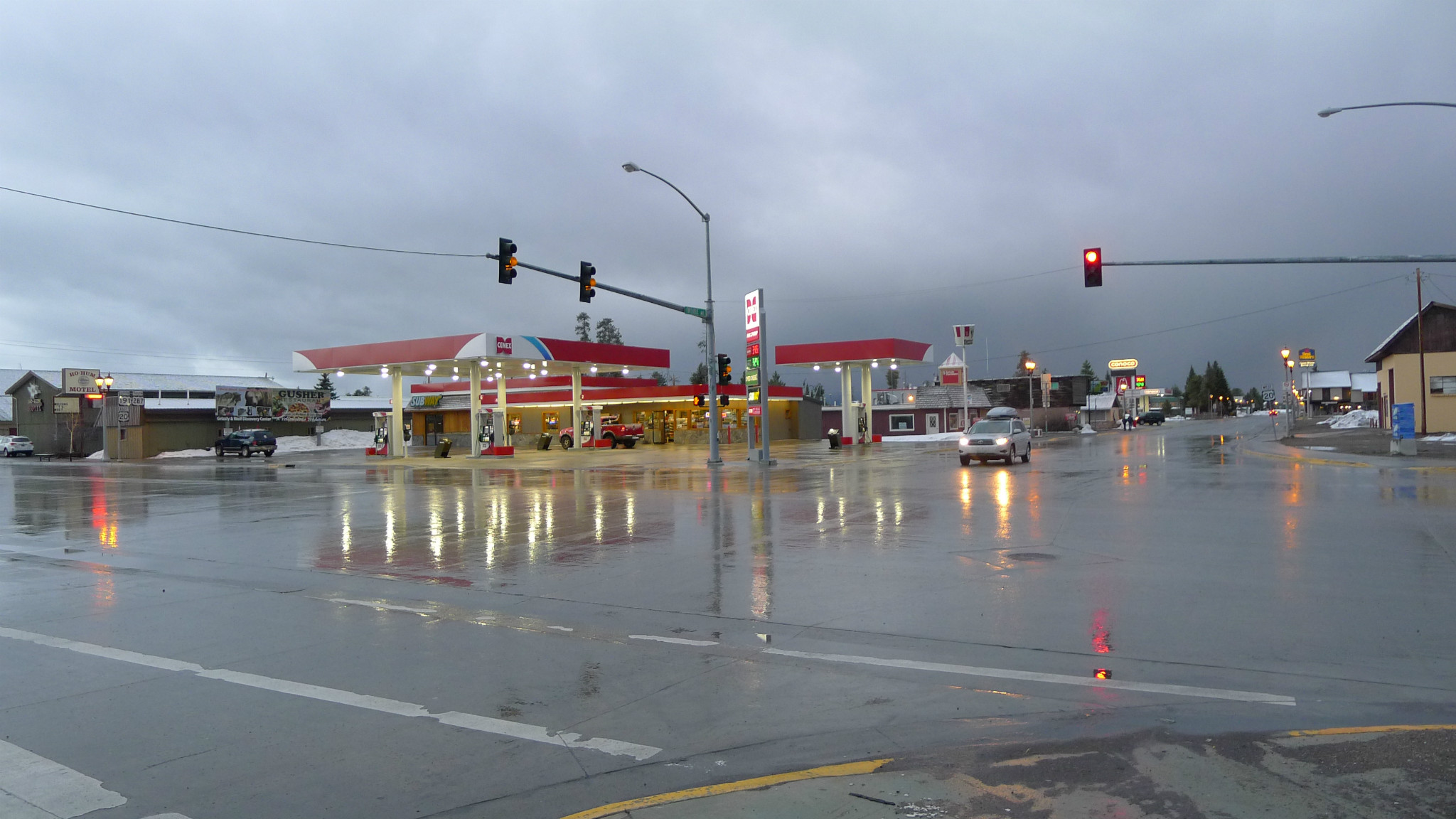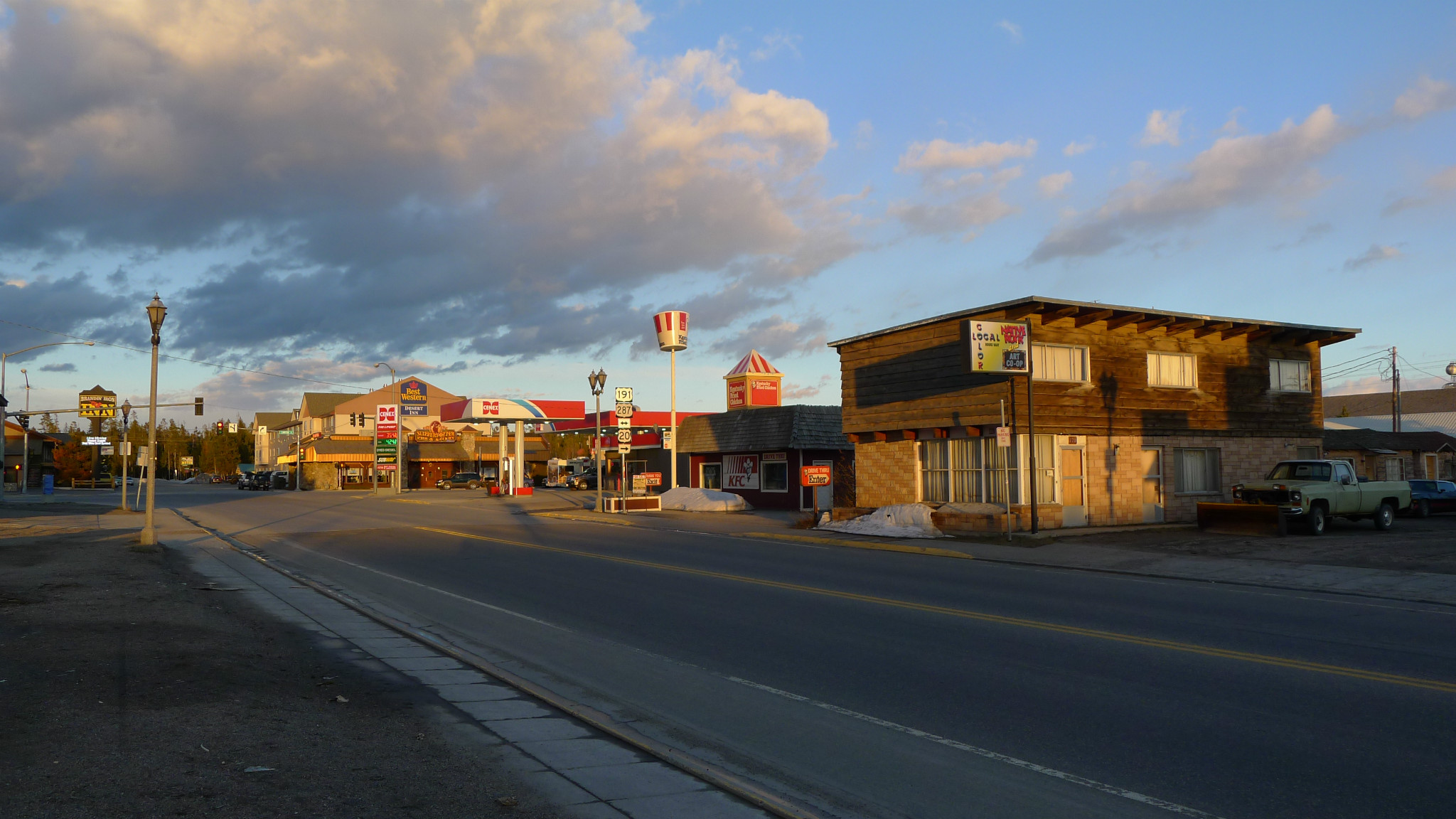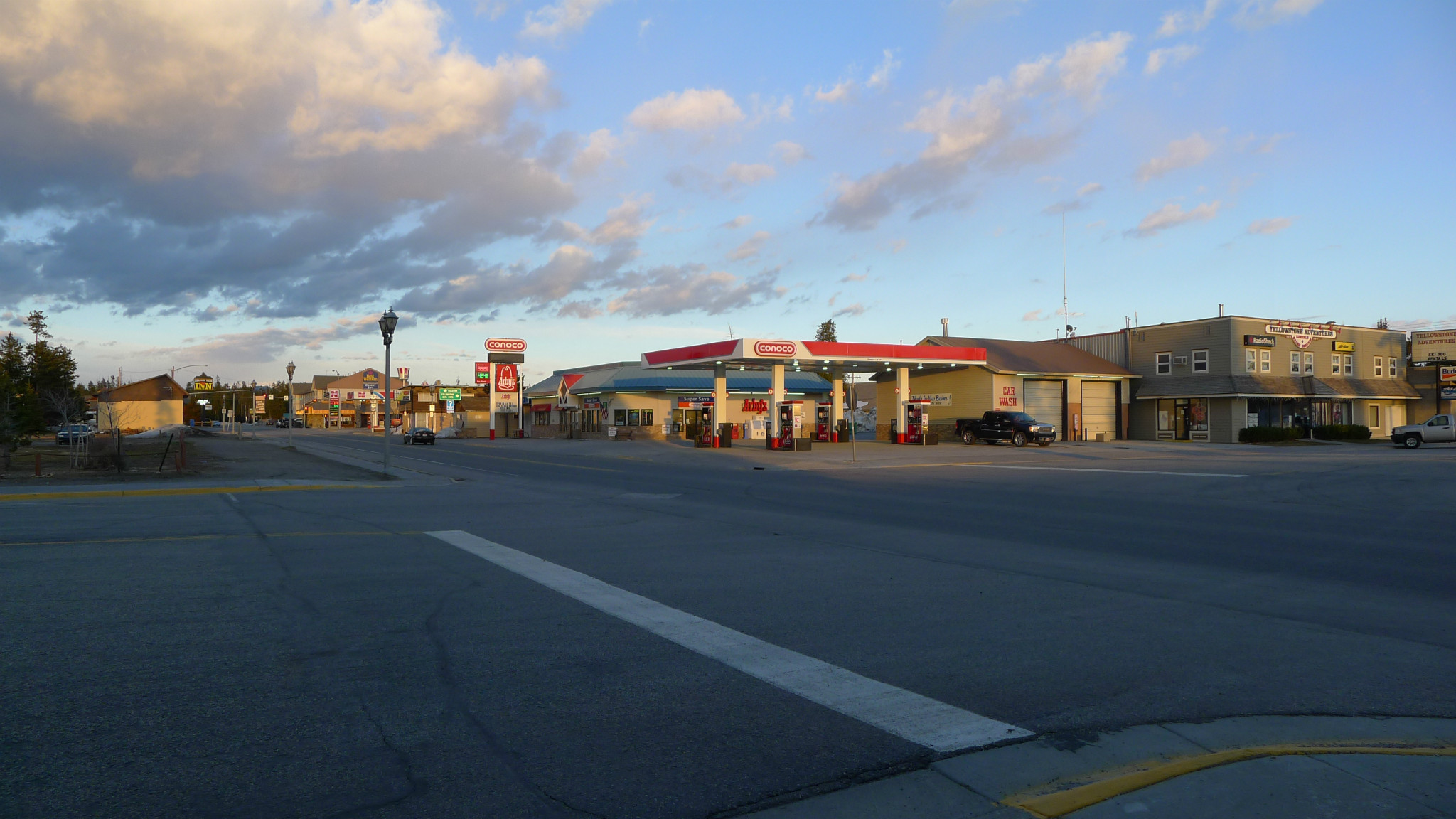 因天气原因,没有过多停留,晚18时终于达到黄石 小镇,晚入住BRANDIN‘S IRON INN 酒店。天空昏暗,疾风卷起大片雪花,小镇被白色笼罩。路上行人稀少,只剩孤零的路灯。周围酒店、饭店开业的不多,导游说5月中旬之后才算旺季,那时会很热闹,游客甚多可以持续半年。