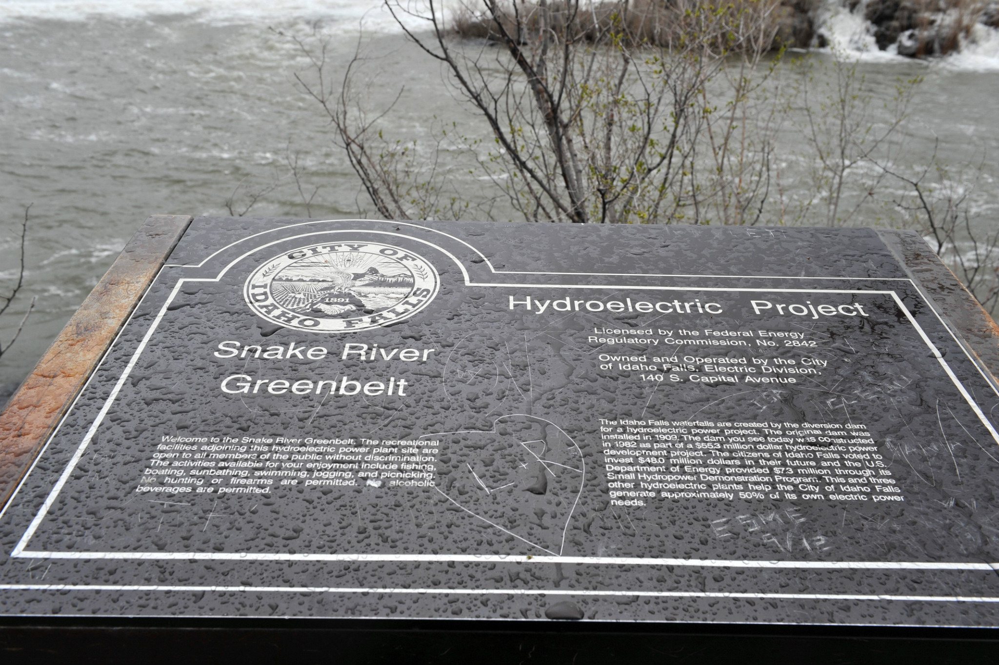 下午15点半到达爱达荷 瀑布(Idaho Fall),天空突然飘起小雪花,气温也明显下降。爱达荷 瀑布位于爱达荷州 的爱达荷 福尔市,是一个在蛇河 上建立的水电站而形成的人工瀑布。现在已成为休闲和旅游景点之一。蛇河 起源于黄石 公园,向西蜿蜒一千英里并穿越爱达荷州 。在蛇河 上修建有十一座水坝,调节河水流速,爱达荷 瀑布是其中的一座。瀑布落差不大平静流淌,河面野鸭、水鸟悠闲游动,有几只小松鼠在树上跳跃。对面岸边矗立漂亮的摩门教堂 。