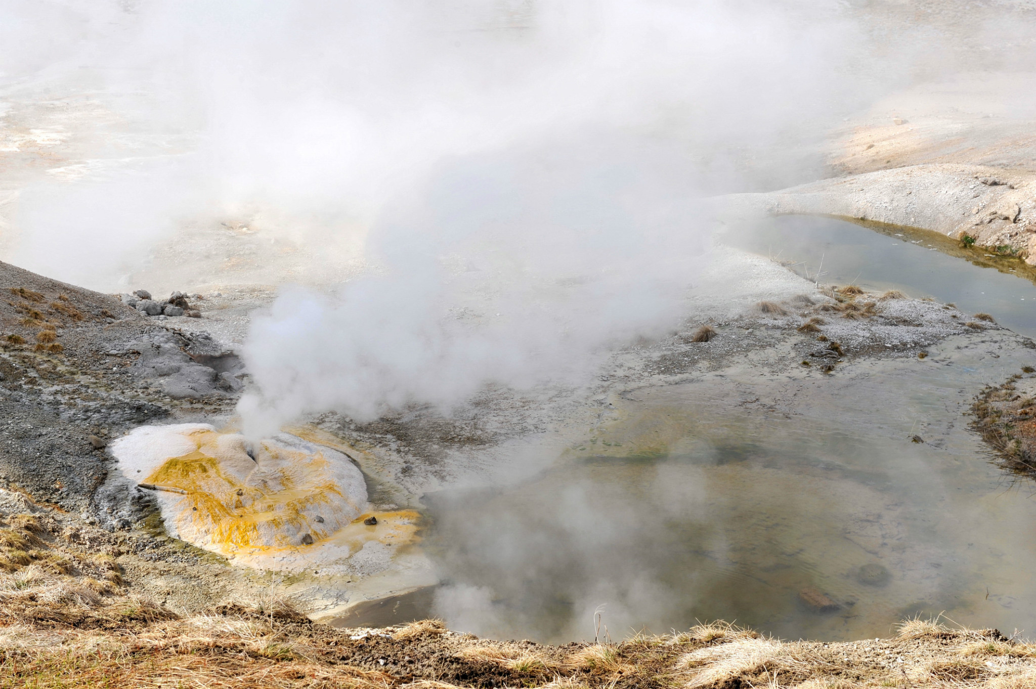 下午到达著名的“老忠实泉”景区,因很有规律地喷水而得名。从它被发现到21世纪的100多年间,每隔33—93分钟喷发一次,每次喷发持续四五分钟,水柱高40多米,从不间断。现在的时间约为93分钟。先在室内观赏,后沿栈道观赏一系列喷泉,有“狮群喷泉 ”等、茶壶喷泉等,均各有特点,奇妙奇异;在此看到郊狼。下午游览上间歇泉及小饼干泉,贝壳泉等,均美仑美奂、美不胜收。