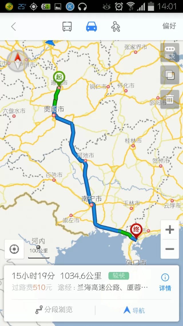 DAY2:10月1日,7:00~23:00,遵义→湛江(麻章区),G75贵州道路缓堵,到中午12点才蠕动了200多公里,耽误了不少时间。