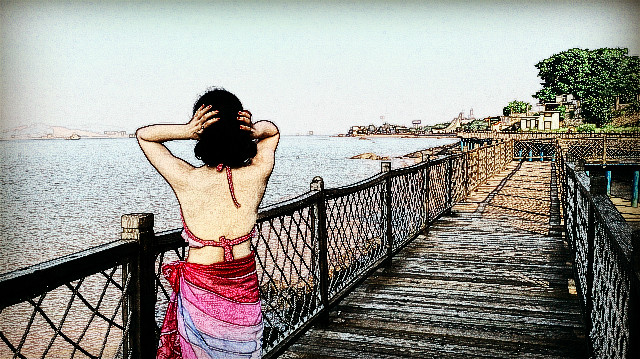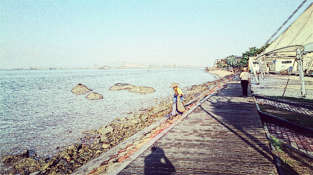 那天清早,在环岛路上,我身穿泳衣和小梧走在海边的栈道上。