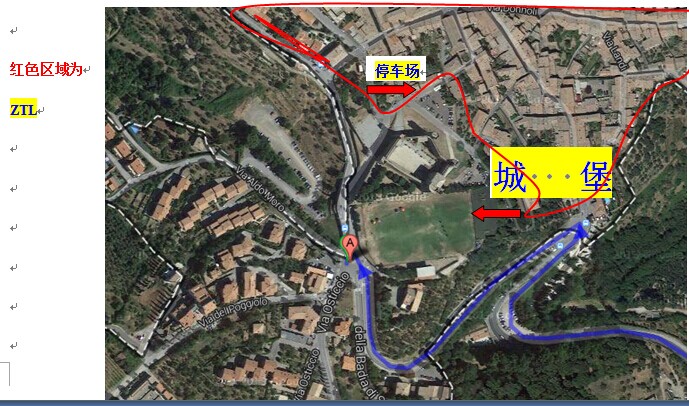 从google图上可以看出停车场位置,以及简单的ZTL区域(红色)和上去停车场的路线(蓝色)