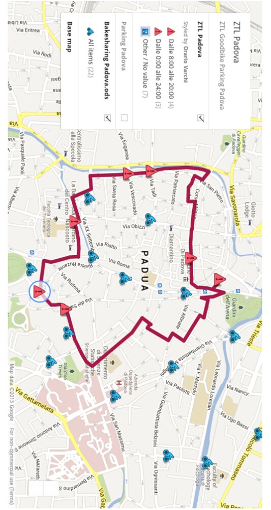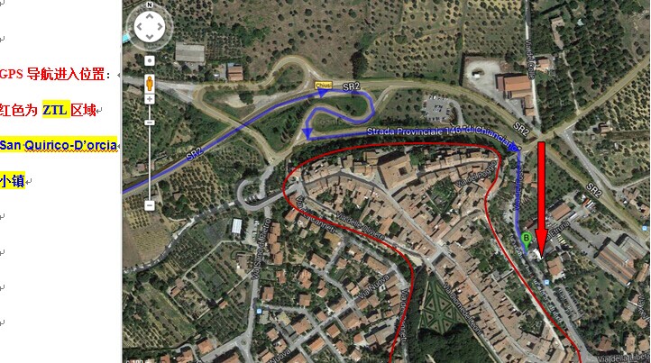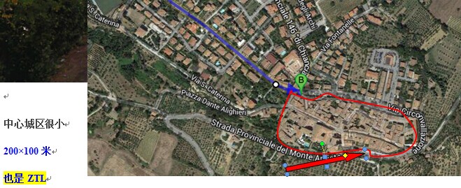 上图,是从google看的停车位置,B点,就是第一张图上的位置。箭头指示的,是免费的停车位,红色圈内的,是ZTL区域....很好认吧?地图上明显的老城区位置