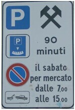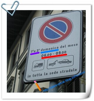上面的标识,意思是:在每个公共停车场都立着这样的牌子:蓝线标出的domenica是意大利语礼拜天的意思。紫线标出的是表示每个月第几个礼拜天,