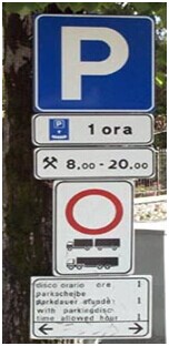 上图这个标识,就是表示:在星期一到星期六之间(星期天是免费的哦,白线、蓝线都全体免费哦,黄线继续还是不能停哦!!!)的早上8点到晚上8点之间,可以免费停1个小时,但是需要在车前窗上摆上你的停车盘(下面会说到停车盘的)。红色圆圈类似ZTL标识的下面,是禁止卡车类的车辆停车