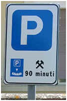 路边如果画了蓝色线框,这是按照小时收费的公用停车场,意大利各城市收费是每小时0.5欧元到1欧元以上不等.这里,是大家可以停车的地方,一般晚18:00-08:00是免费时段,礼拜天也是全天免费.