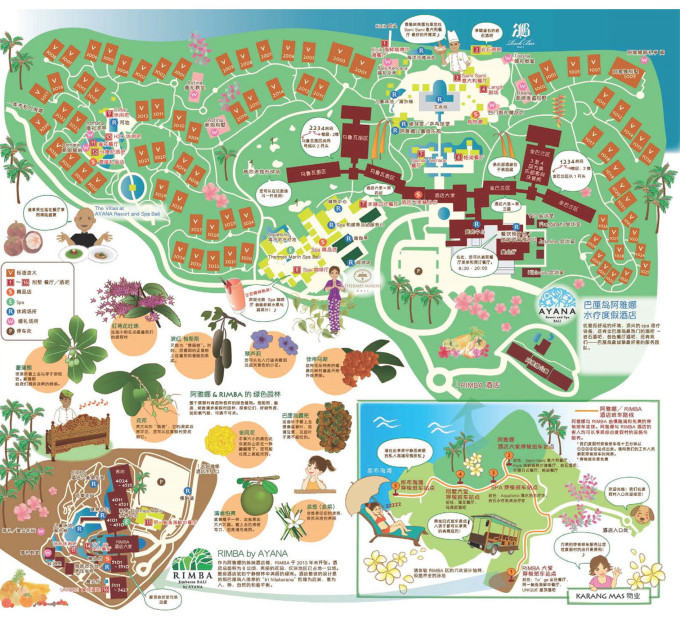 AYANA的客房其实离海都有一段距离,园景房resort view和海景房ocean view景观其实差别不大,因此园景房性价比更高。有米的童鞋可以选择他家的别墅,幽静且临海。如下面的AYANA园区地图,紫红色部分为客房区,离海有一段距离。橙色的是别墅区,部分拥有无敌海景。