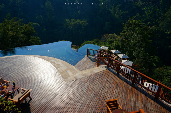 感受:酒店位于乌布北部的雨林幽谷中,依山傍河,地理环境得天独厚,招牌是双层无边泳池,据说是茱莉亚罗伯茨拍摄Eat Pray Love时下榻的酒店。房型主要有Panoramic Deluxe Pool Villa(全景)和Riverside Deluxe Pool Villa(河景),区别在于地势高低,地势较高的全景view更壮丽。酒店修建于2005年,设施设备略显旧,服务也不是那么贴心,整体感觉性价比不高,回来觉得荷包隐隐作痛T.T。