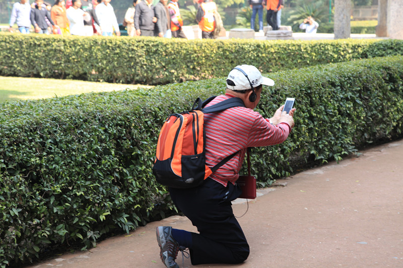 隆重介绍一下我家老爷子,1937年生人,此次印度之行就是他老人家的旨意,以前出去旅游,每到一处必要留影,经常是我们看到美景,举起相机正要按下快门时,他冲进了画面,引得我们有些小意见。这次他不求人了,掏出去年在美国买的苹果5——自拍!这不,为了拍到高塔的全景,不惜摆出这雷人的姿势,老爷子为了详细了解,还专门租了解说器。当时看到这情景,立马把我们笑翻了。真是与时俱进的老头儿!!!