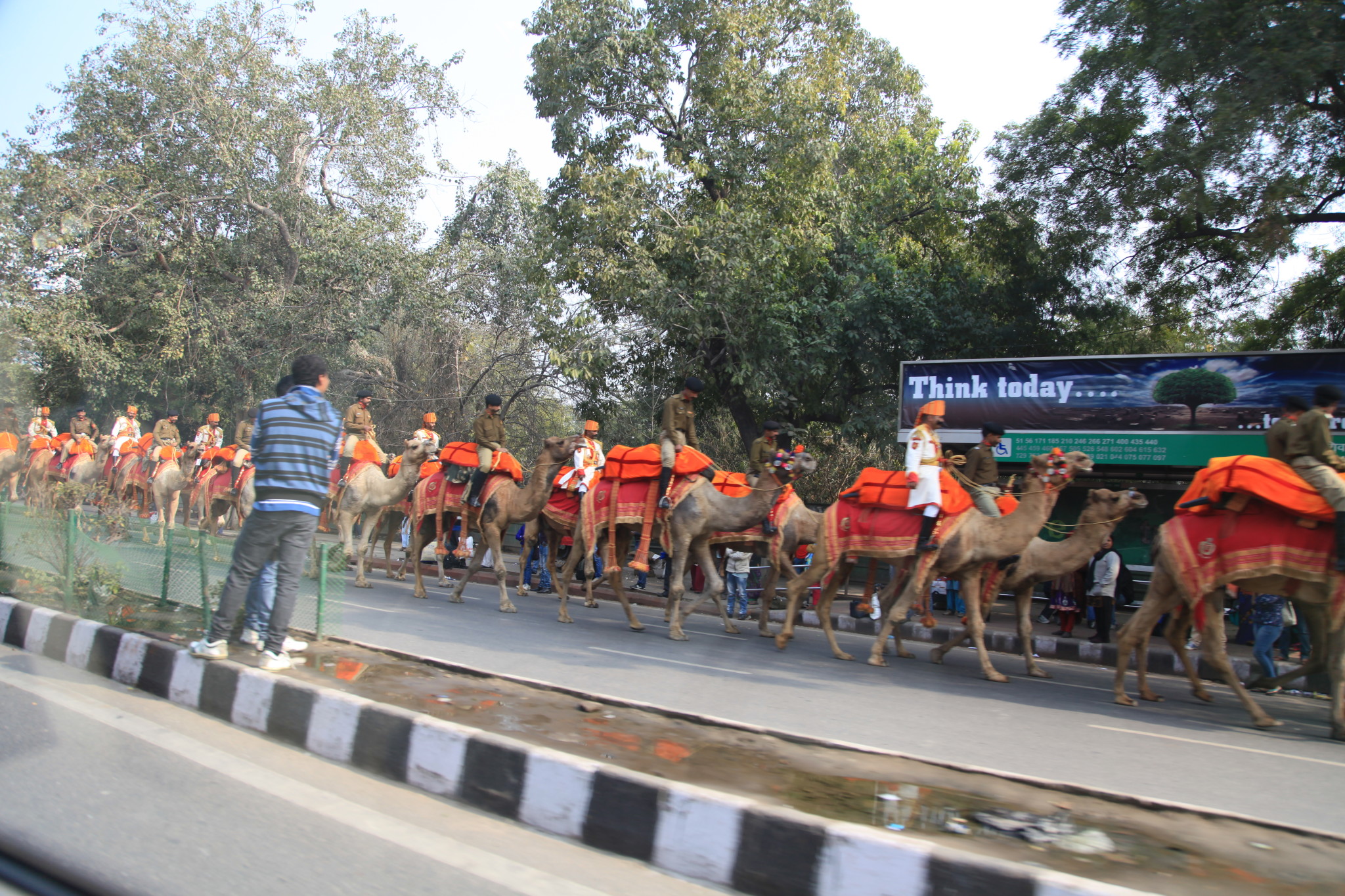 这一天正赶上是印度的国庆,上午有游行检阅等庆祝活动,我们的飞机延误也许和这个有关。游行回来的骆驼队。