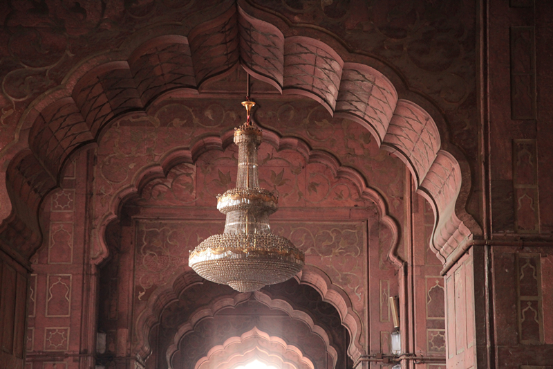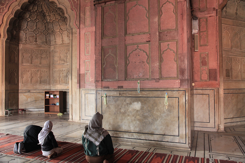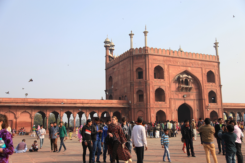去不了红堡,我们就去了对面的贾玛清真寺北门,这里也没有售票窗口,有几个男人手上拿着像我们这里公交车票样的小纸条在卖票,外国人每人300卢比,相机(含手机)150卢比一部,女士还要批上特定的花袍,50卢比一位,简直就是抢钱的架势,开始我们很不爽,说不进去了,后来想想算了,来一趟不容易,还是认宰交钱了,但是鞋子放进自带的塑料袋,自己拎着。