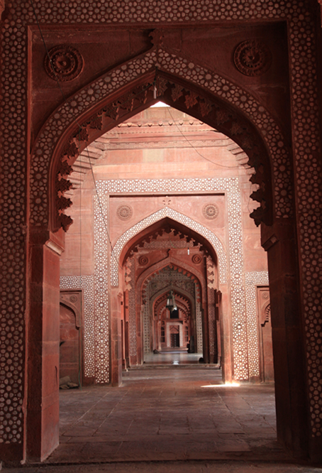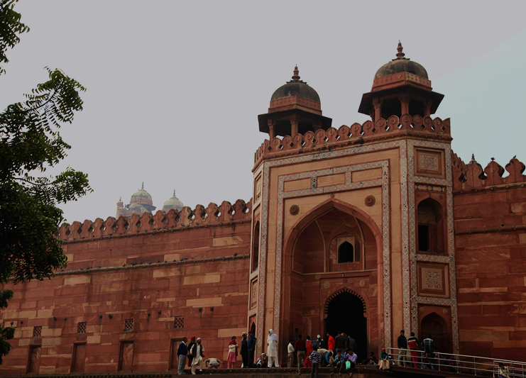到了停车场,还要向右边穿过一小片树林,才能看到转乘的大巴站。坐了5分钟的大巴,到了停车场,左边是大清真寺,右边是法塔赫布尔西格里城,我们先去了清真寺。有个年轻人跟着我们要当导游,费用人民币10元,我们开始说不用,他为了打消我们的疑虑,说不是所有印度人都是坏人,五个手指还不一样长呢,我们就答应了,后来证实这个决定是错误的,由于我们赶时间,他却一个劲地讲历史,我们不懂也没兴趣,居然还要带我们去买东西,最后给了他钱就打发了。