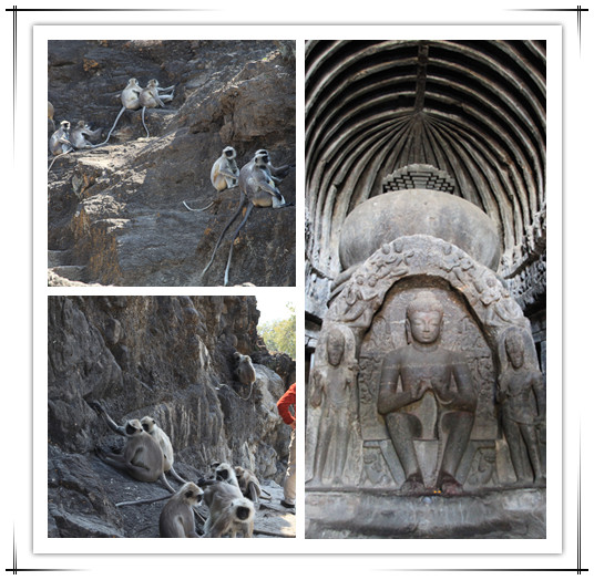 我们从16窟的右边走上山,俯视全貌后,从左边下山,开始只有我们4个人,一会儿有一个印度导游,带着一位不知是什么教的印度师傅和一个中国人,也爬上来了。快到路边的时候,突然出现一个猴群,吓得我们够呛,好在印度导游帮我们挡住猴群,我们才惊恐地走下来。