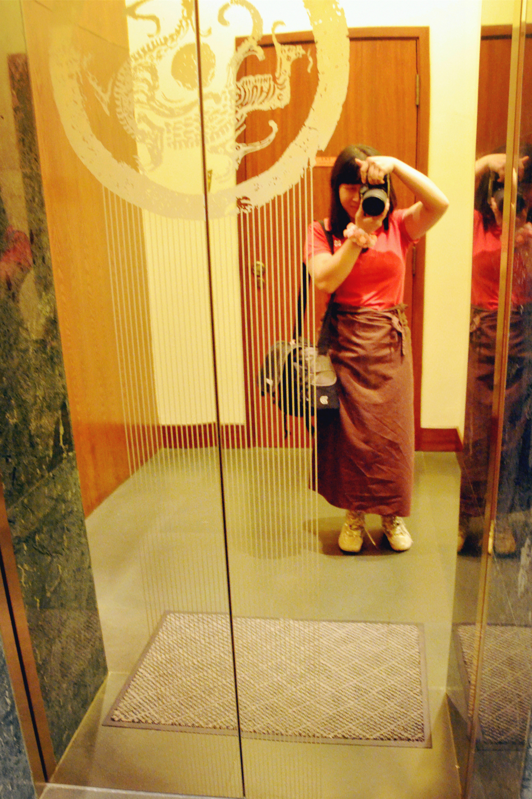 由于这里是佛堂,穿着要严肃。穿着短裤的我披上摆放在寺庙入口处所提供的有点像围裙的衣料。(记得用完后摆放整齐)