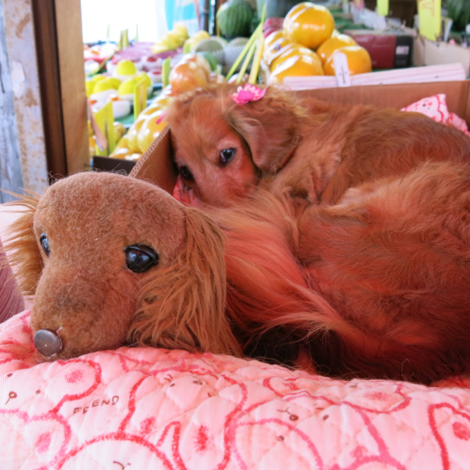 街角賣水果的老奶奶養了一隻臘腸犬,每天打扮得美美的,她叫「茶子」,大多時間都是睡在水果攤邊上的盒子裏,不吵不鬧得~旁邊是老奶奶給她準備的小夥伴、開始我還以為是兩隻小狗!好有愛