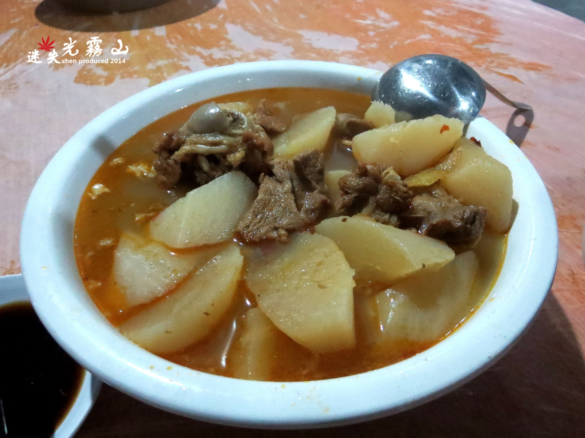 不到六点,天空中浓云密布,伴着夜色将人压得透不过气,淅淅沥沥的小雨敲打在我们身上,此时的我们已经是饥肠辘辘了。从住宿的地方过个马路走到岔路口的姐妹农家乐(/poi/8447362.html),品尝当地的特色南江黄羊。热乎乎的肉汤,熟烂的羊肉,绵软的萝卜,说话间风卷残云一般扫荡一空。一个字,美!