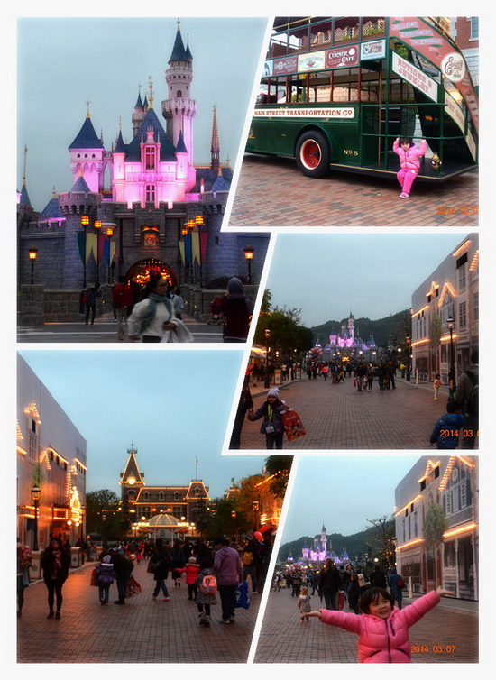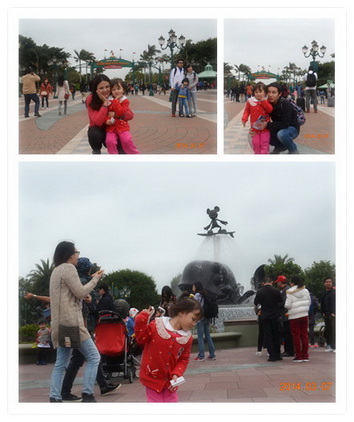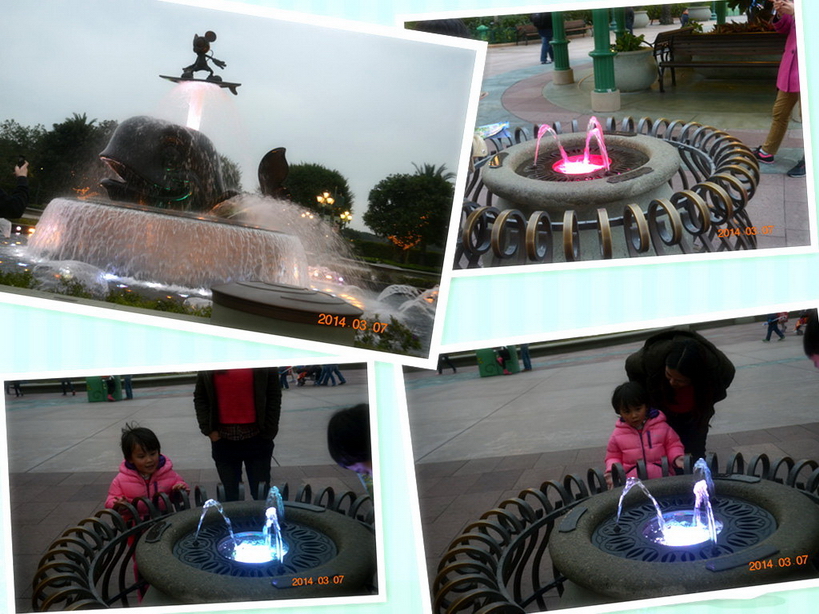 迪斯尼门口,从地铁上下来还是要走一点远,才到门口。地铁旁有巴士站,循环接送游客,迪斯尼--好莱坞酒店--迪斯尼酒店,三个点循环。这个米奇喷泉很有意思,活动的,晚上还发光。