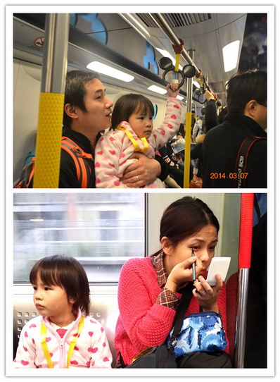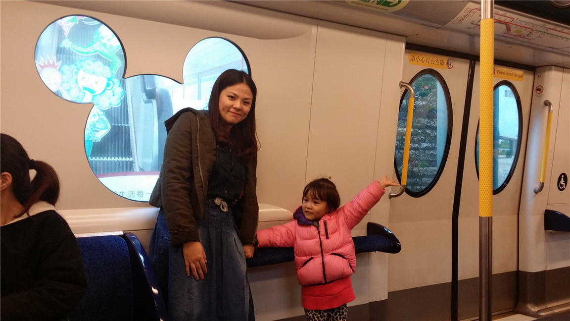 港铁迪斯尼线,专用列车,拉手都是米奇的哦!妈妈忙补妆。因为香港就一个行程---迪斯尼,所以吃完翠花就直奔而去了。