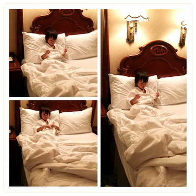 回到酒店,兜子换上小孩专用的浴袍,看着还是那么回事。提醒大家一下,迪斯尼离市区较远,酒店消费较贵,外面也没有什么卖东西的地方,我还是坐地铁去青衣站买的东西。